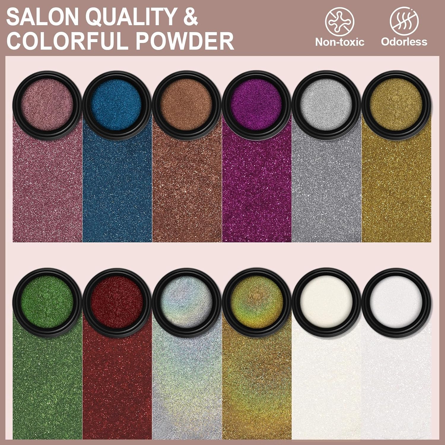 • QUALITY AND QUANTITY :Each jar has 1 gram of powder, instead of just a little bit per jar. Artdone chrome nail powder has very good shining mirror effect, they can made different effects with different background colors. If you need a darker color, you can choose black or another dark color as the base color, if you need a lighter color, you can choose a white、pink or transparent base color to applied powders