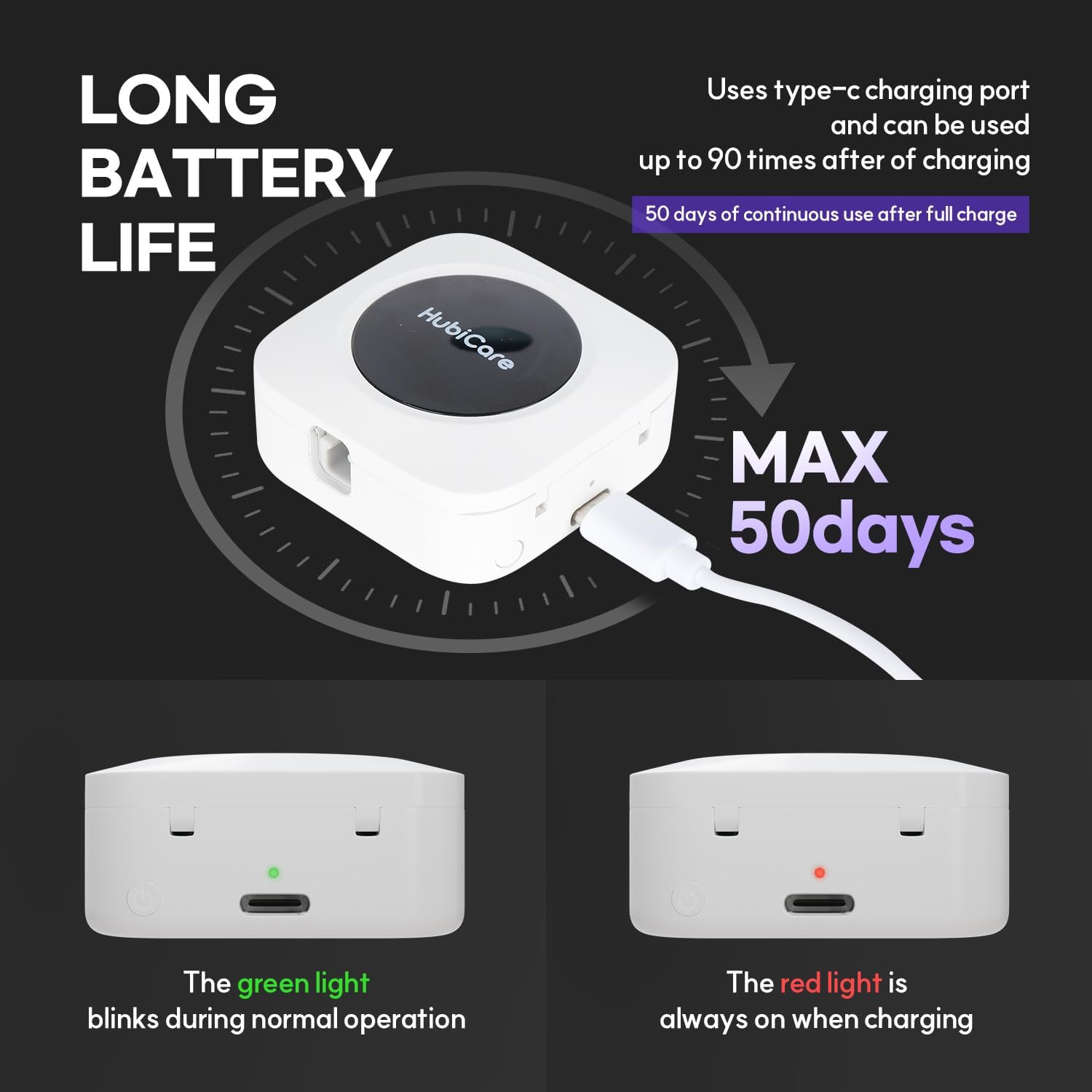 • ✅【Over 50 Days Life】HubiCare Toothbrush Cleaner uses a 300mAh battery and charges with a USB-C type cable. It can be used for more than 50 days when fully charged. One charge can be used for one month. When the battery is low, the red LED will flash, and it will be steady while charging. It will turn green when charging is complete.