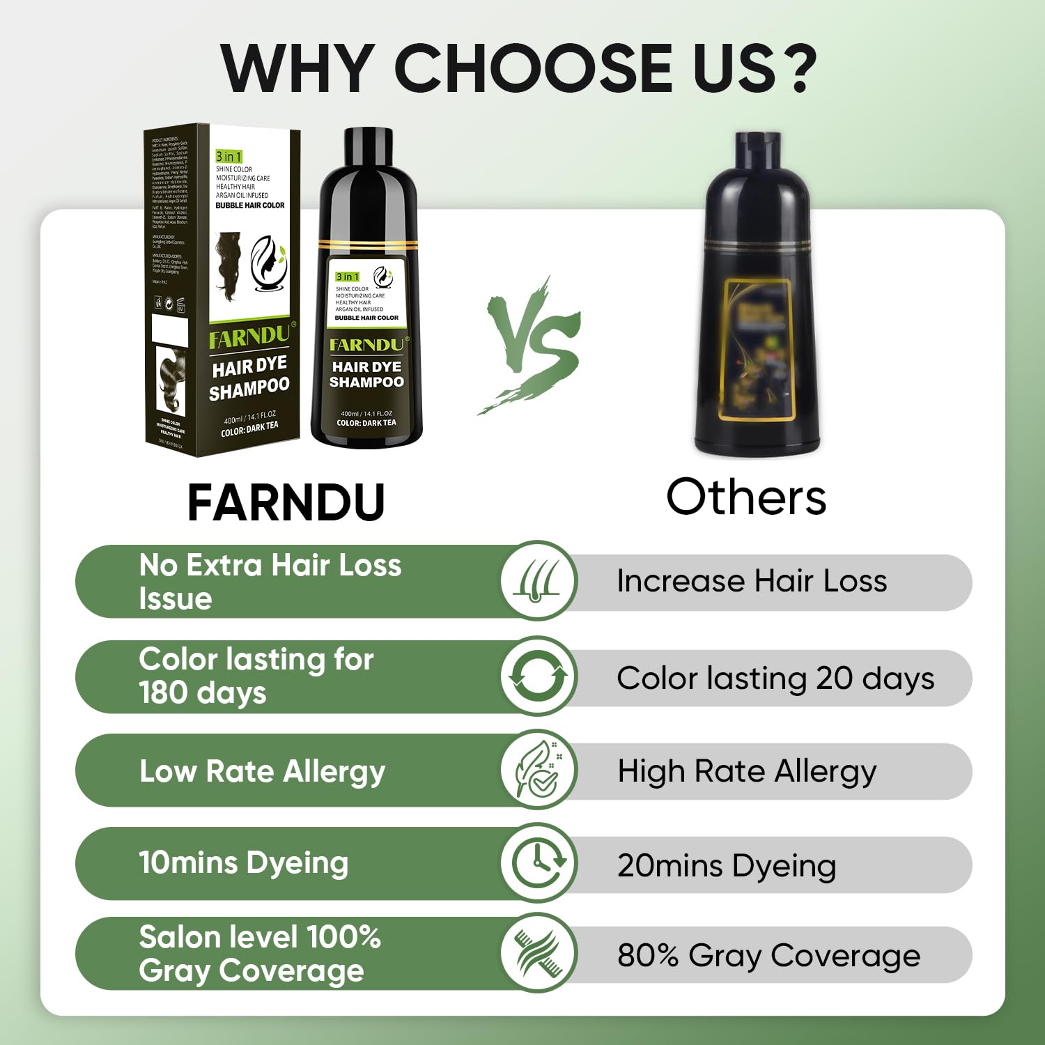 • GRAY HAIR COVERAGE SHAMPOO – Obtain back the fresh-looking hair of your younger days, get back the lost luster, and replenish the health of your weak strands with FARNDU black hair color shampoo for gray hair. Formulated to help you achieve vibrantly colored locks, this hair color shampoo dye will treat your hair with a special combination of active botanicals.