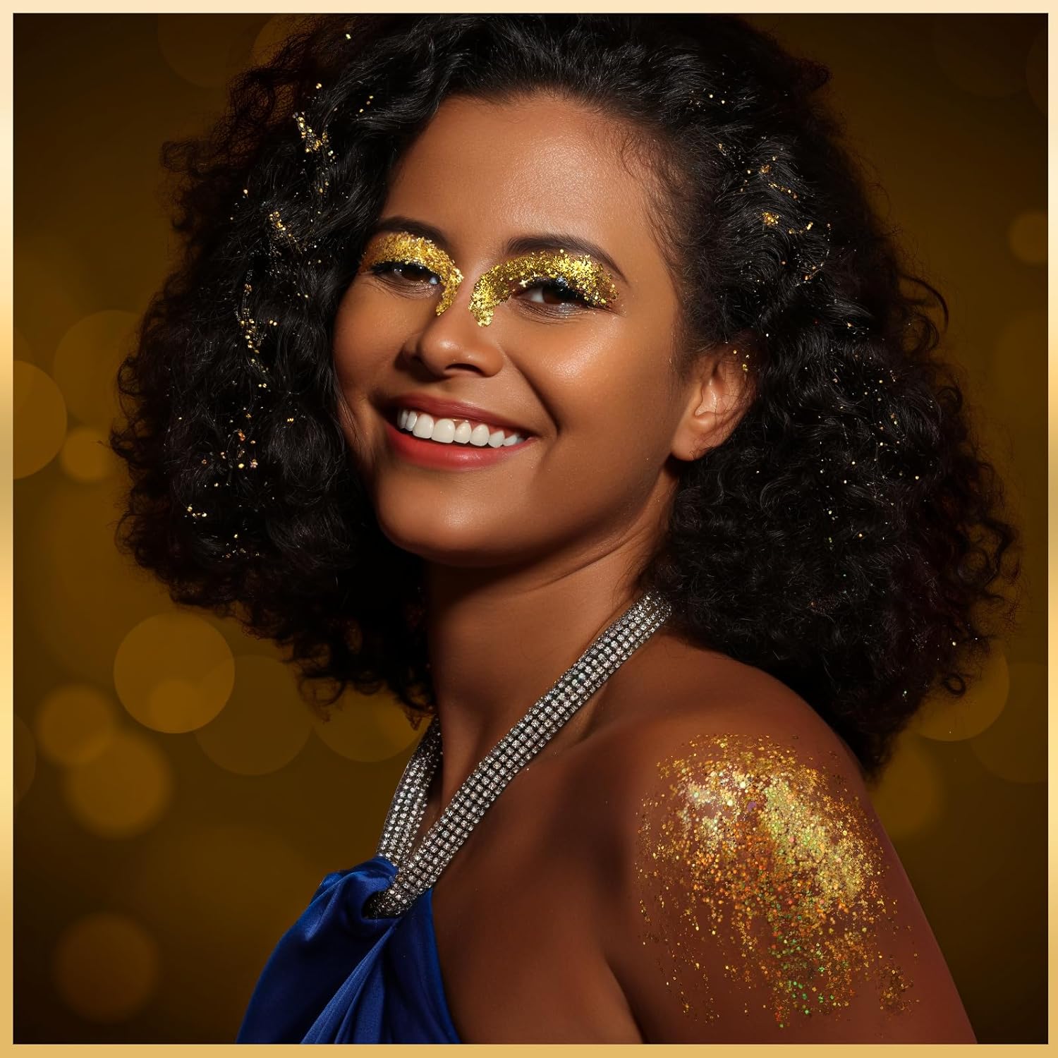 • GOLD GLITTER FOR FACE - Each glitter is securely stored in a compact container, ensuring easy storage and maintaining its freshness. The iridescent hues and vibrant gold are breathtakingly beautiful, making this set perfect for crafting festival-inspired looks for children of all ages. Plus, the handy jars fit seamlessly in your bag for on-the-go shimmer