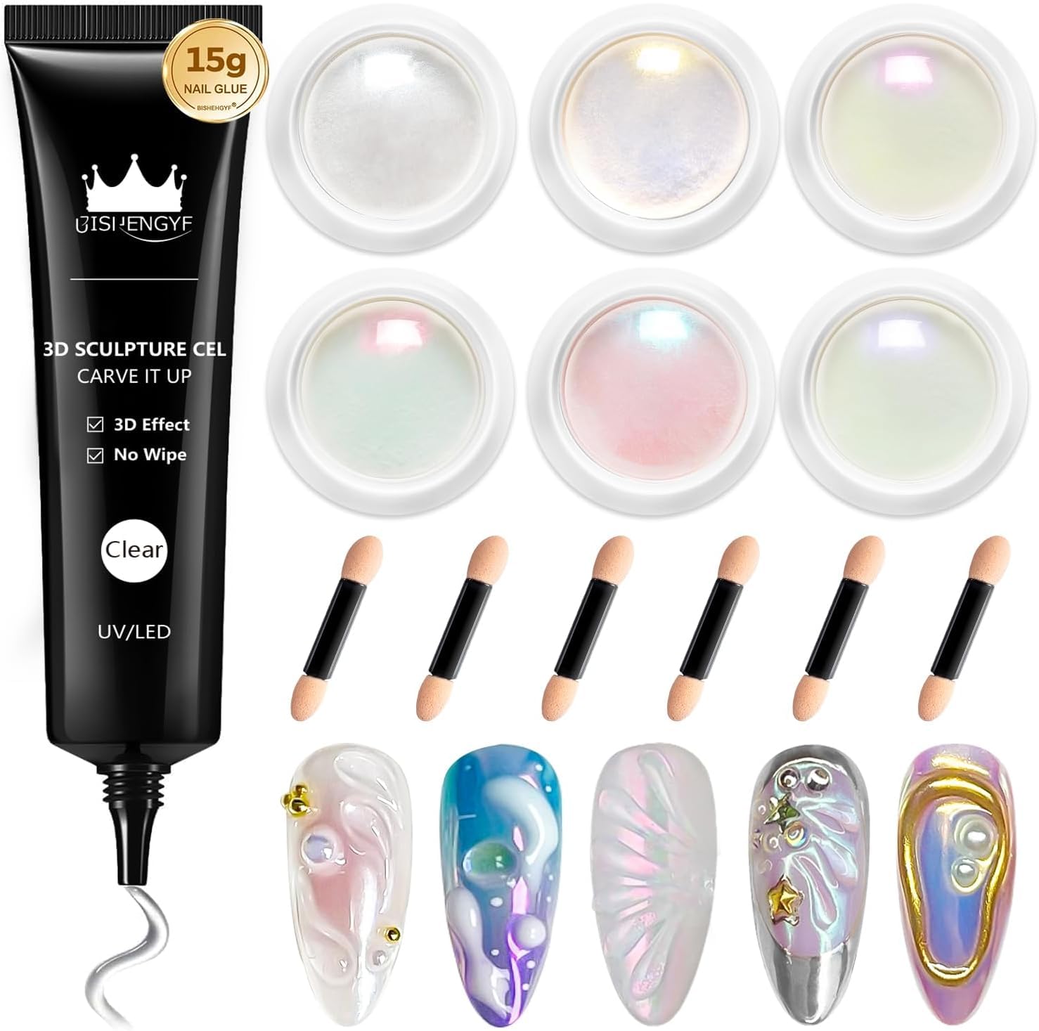 • 3D Nail Gel & Chrome Powder Kit: BISHENGYF upgraded 3D nail art sculpting gel kit include 15g clear nail sculpting gel, shiny white pink yellow green purple and orange chrome powders, and sponge sticks. Friendly for nail beginners and nail lovers, allows nail art beginners to create stunning nails at home and DIY enthusiasts for 3D gel nail art sculpture.