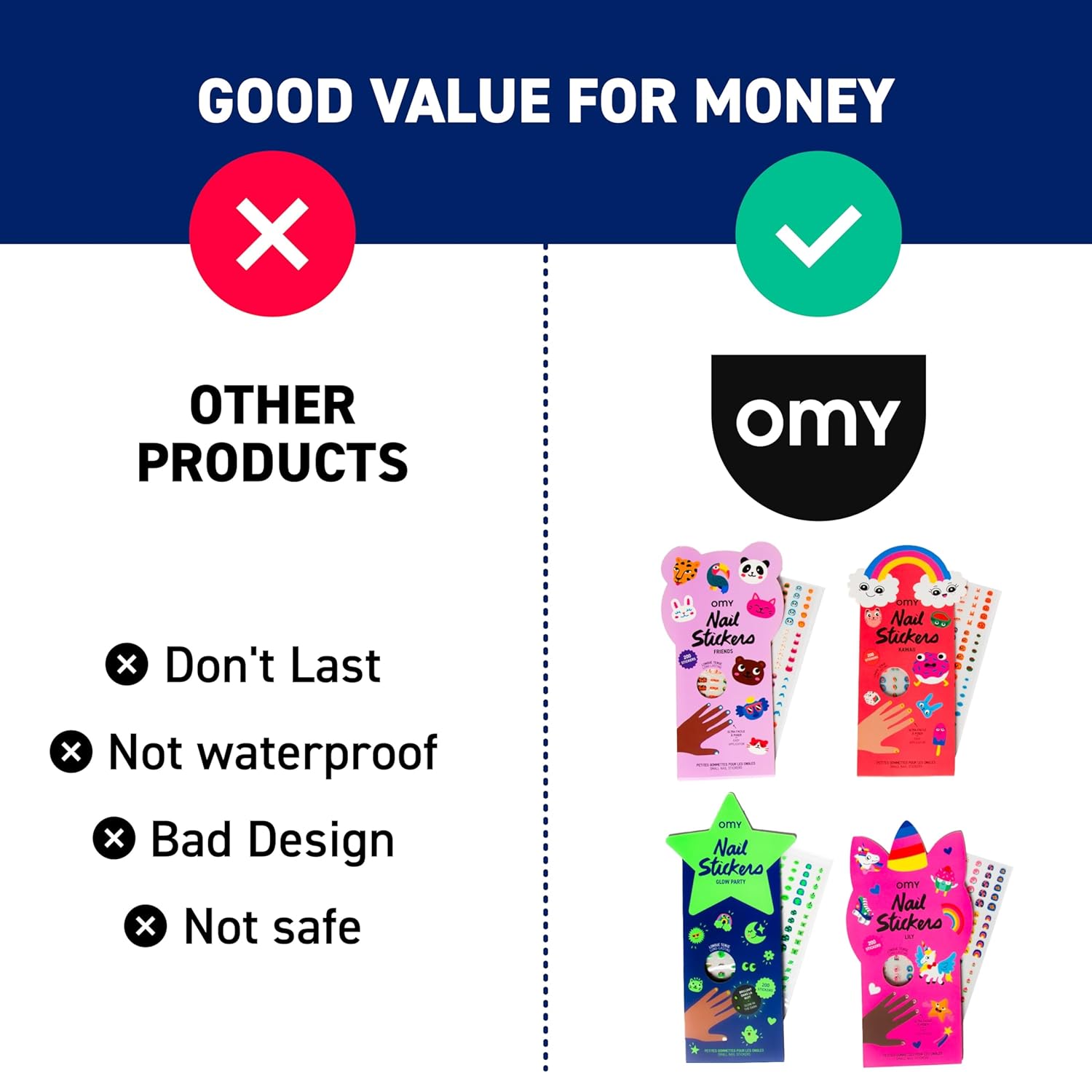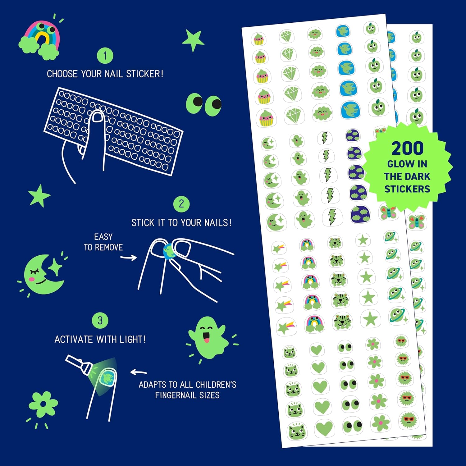 Omy Glow in The Dark Nail Stickers for Kids - 200 Stickers, Waterproof, Durable, Fun, Creative Designs | Strong Enough to Last Through Hand Washing - Easy to Apply, Safe, Non-Toxic | Age 3 and Up