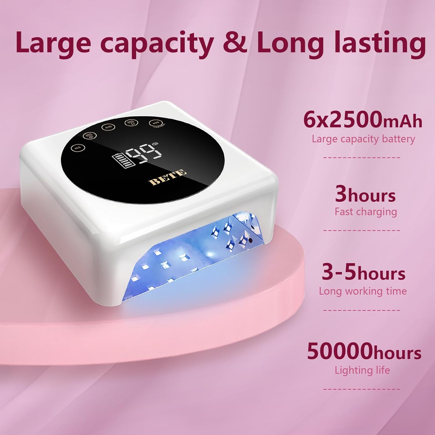 • 【Rechargeable & Cordless】BETE cordless LED nail lamp has a built-in rechargeable 6x2500mAh durable battery that can be charged for 3 hours and use for 3-5 hours. Rechargeable and cordless design that makes you can enjoy it anywhere