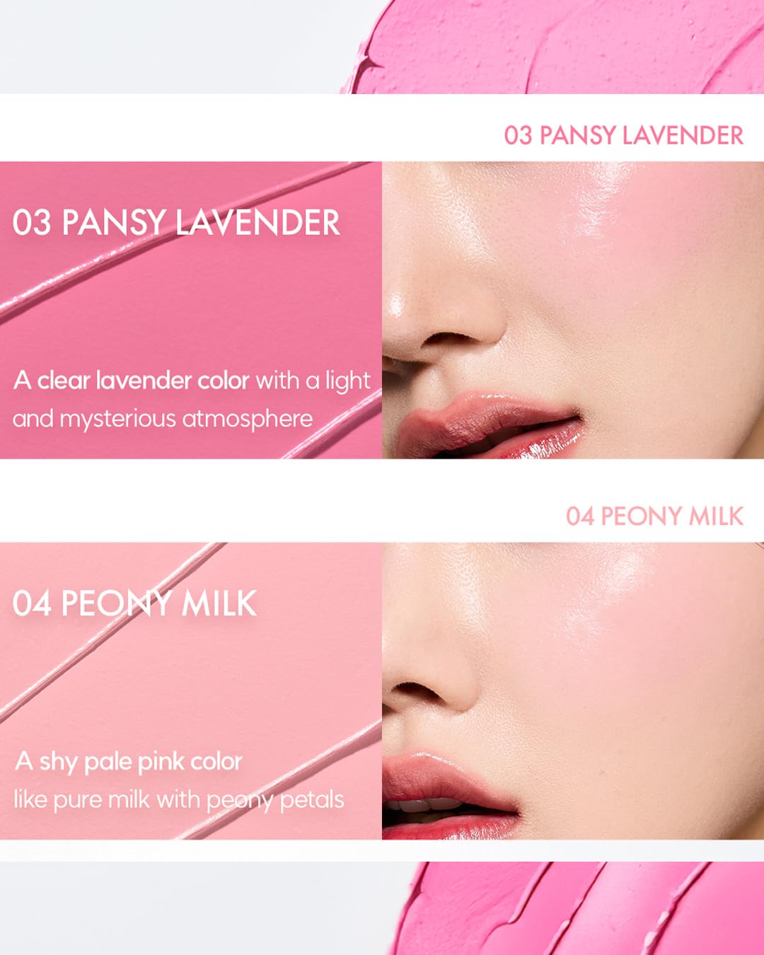• PEONY MILK: Like pure milk mixed with peony petals, this shy pink color cream blush brings a delicate flush to your cheeks. Its gentle hue is suitable for all skin tones, offering a naturally soft, milky pink that enhances your complexion with a romantic and youthful glow.