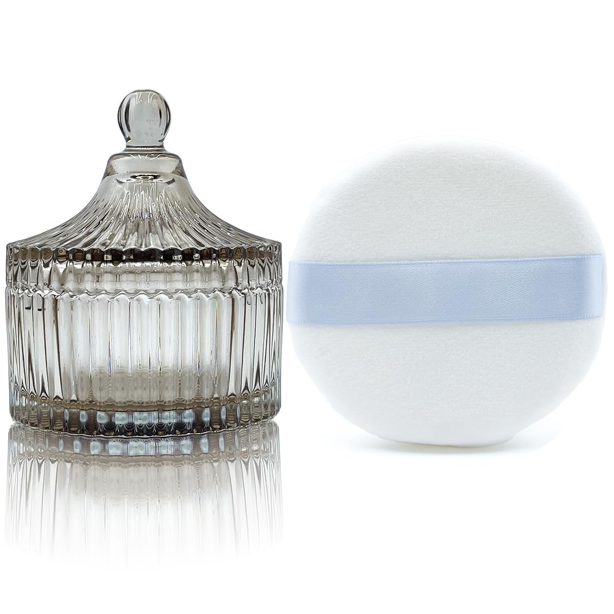 • Size:Powder puff:Diameter 3.3 inches,Thickness 0.6 inches.Glass container:Diameter: 3.8 inches,Height: 4.8 inches (including lid).This is a perfect combination of powder puff and container,elegant and concise,both practical and beautiful.
