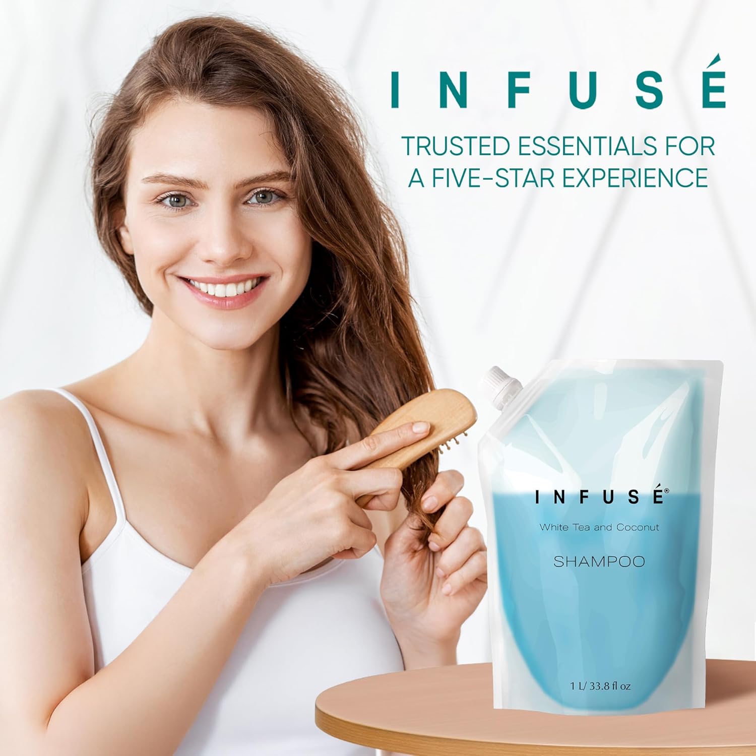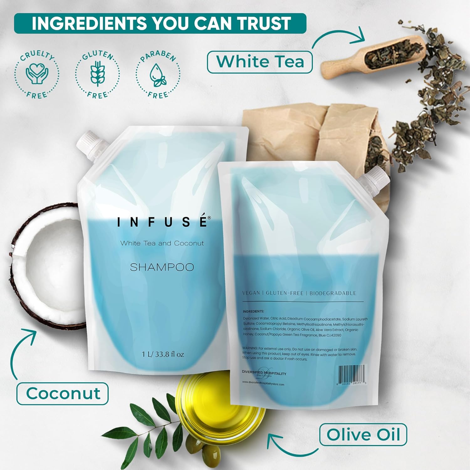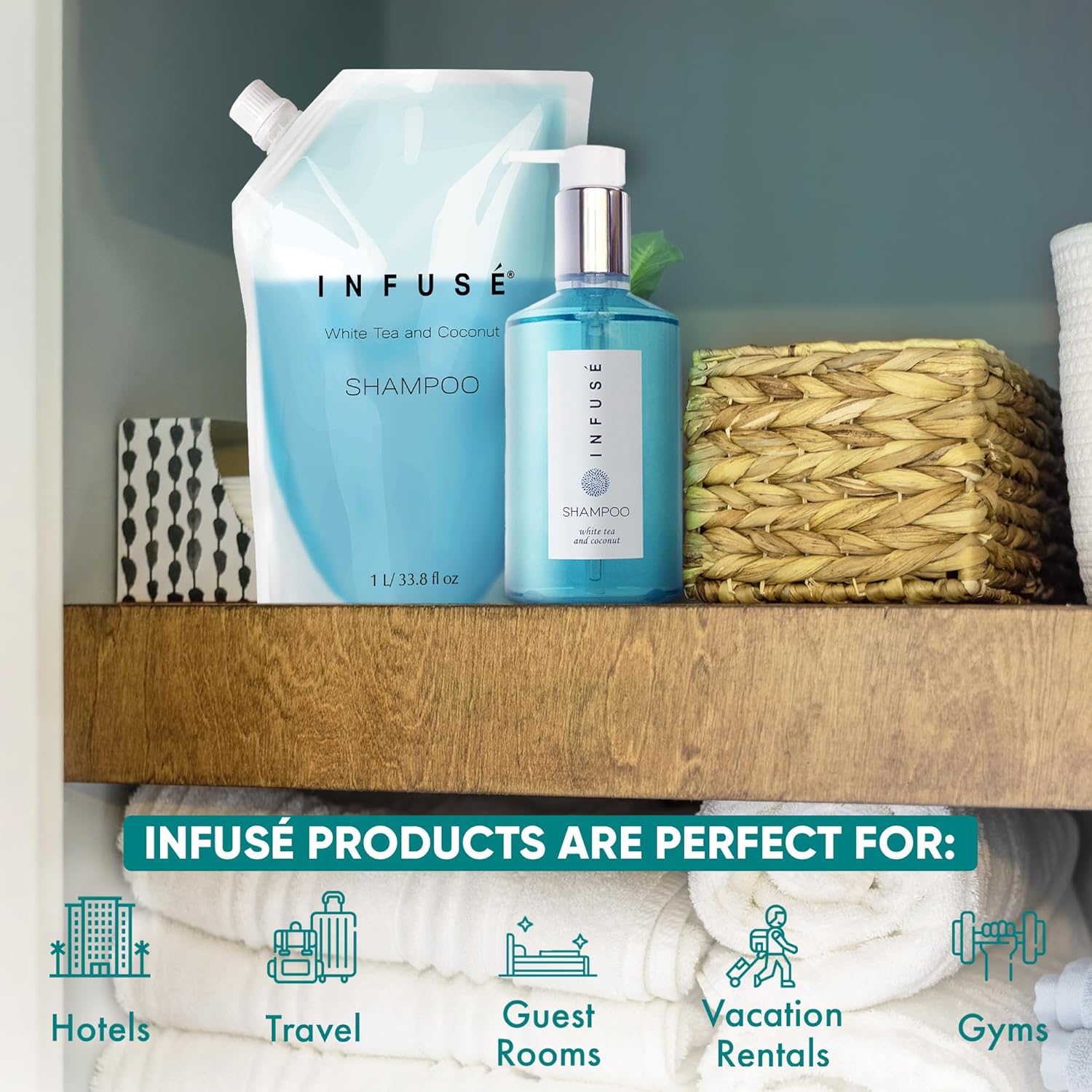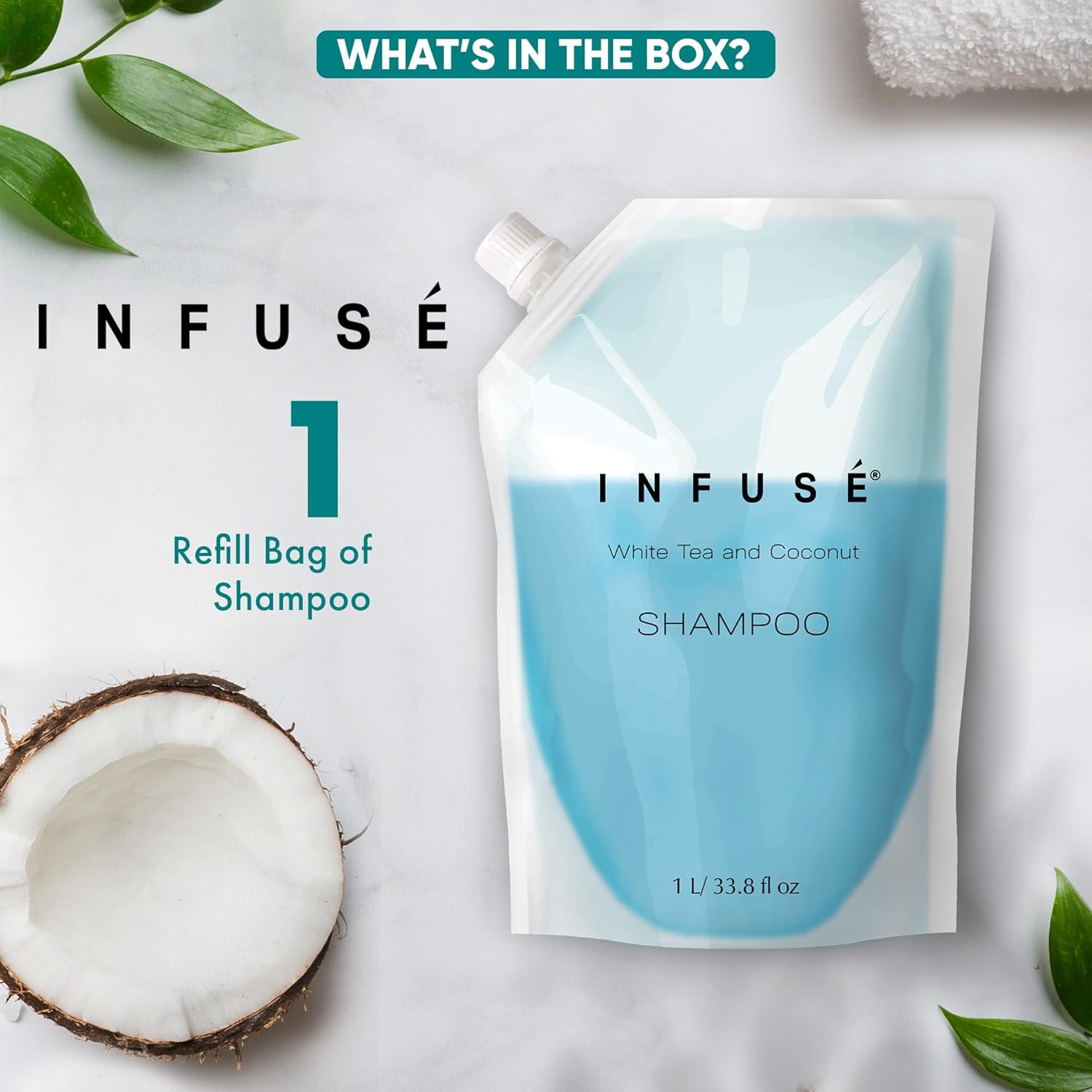 • HOTEL-QUALITY, LUXURIOUS AMENITIES: Enhance your guest experience with the Infuse White Tea and Coconut in a convenient 1-Liter Refill Bag, designed to refill wall-mounted and stand-alone dispensers. Enriched with white tea, coconut, organic aloe, and olive oil, this gentle, daily-use formula suits sensitive skin and hair. Ideal for hotels, vacation rentals, guest bathrooms, and homes, these premium amenities add sophistication and functionality to any hospitality space.