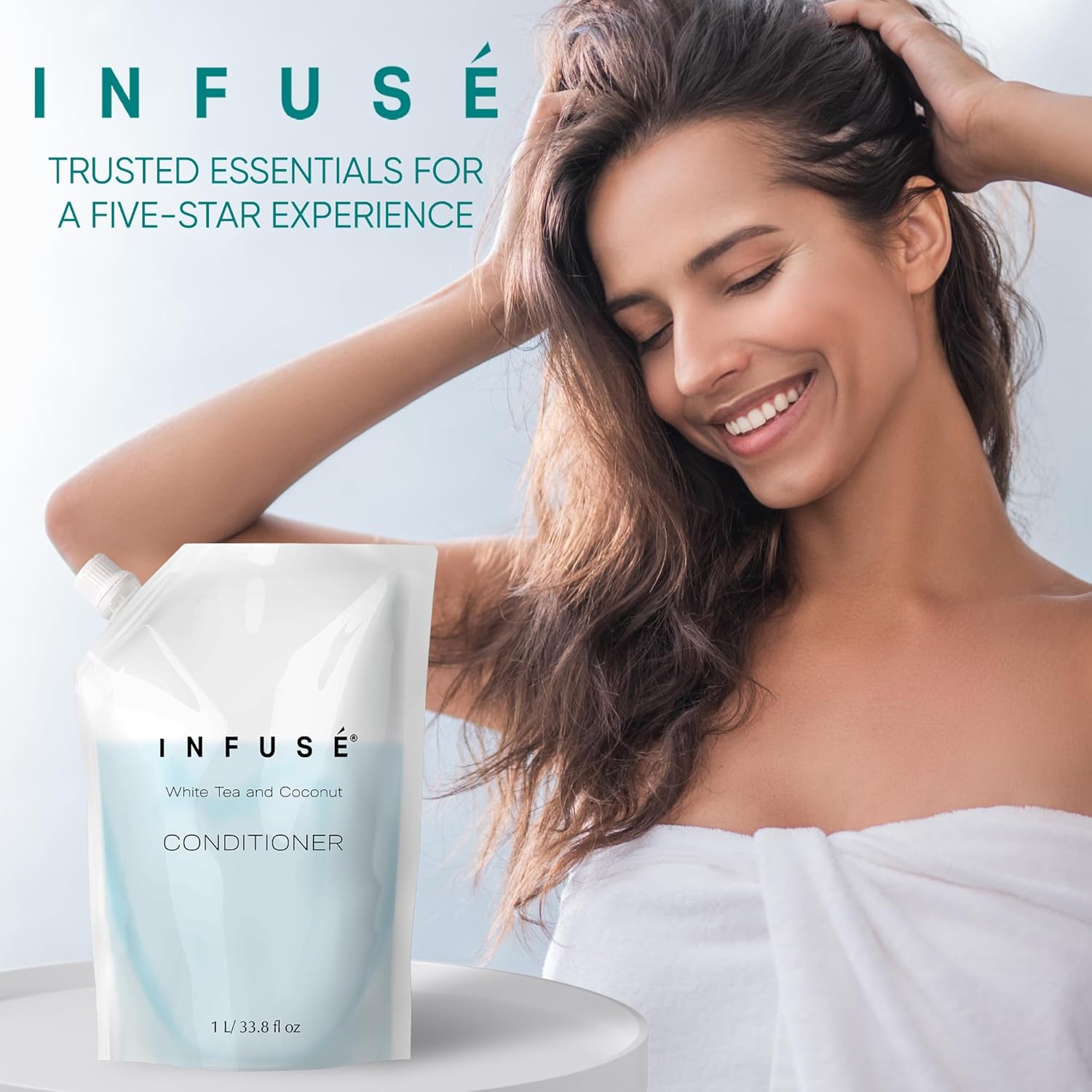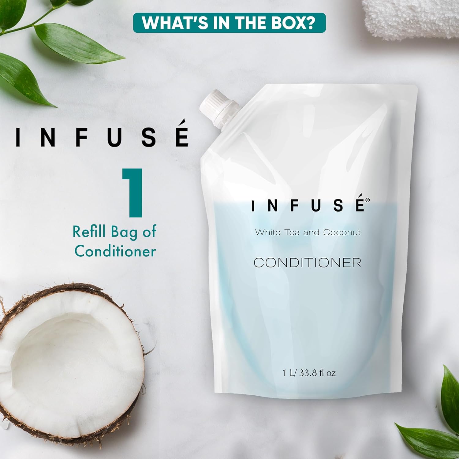 • HOTEL-QUALITY, LUXURIOUS AMENITIES: Enhance your guest experience with the Infuse White Tea and Coconut in a convenient 1-Liter Refill Bag, designed to refill wall-mounted and stand-alone dispensers. Enriched with white tea, coconut, organic aloe, and olive oil, this gentle, daily-use formula suits sensitive skin and hair. Ideal for hotels, vacation rentals, guest bathrooms, and homes, these premium amenities add sophistication and functionality