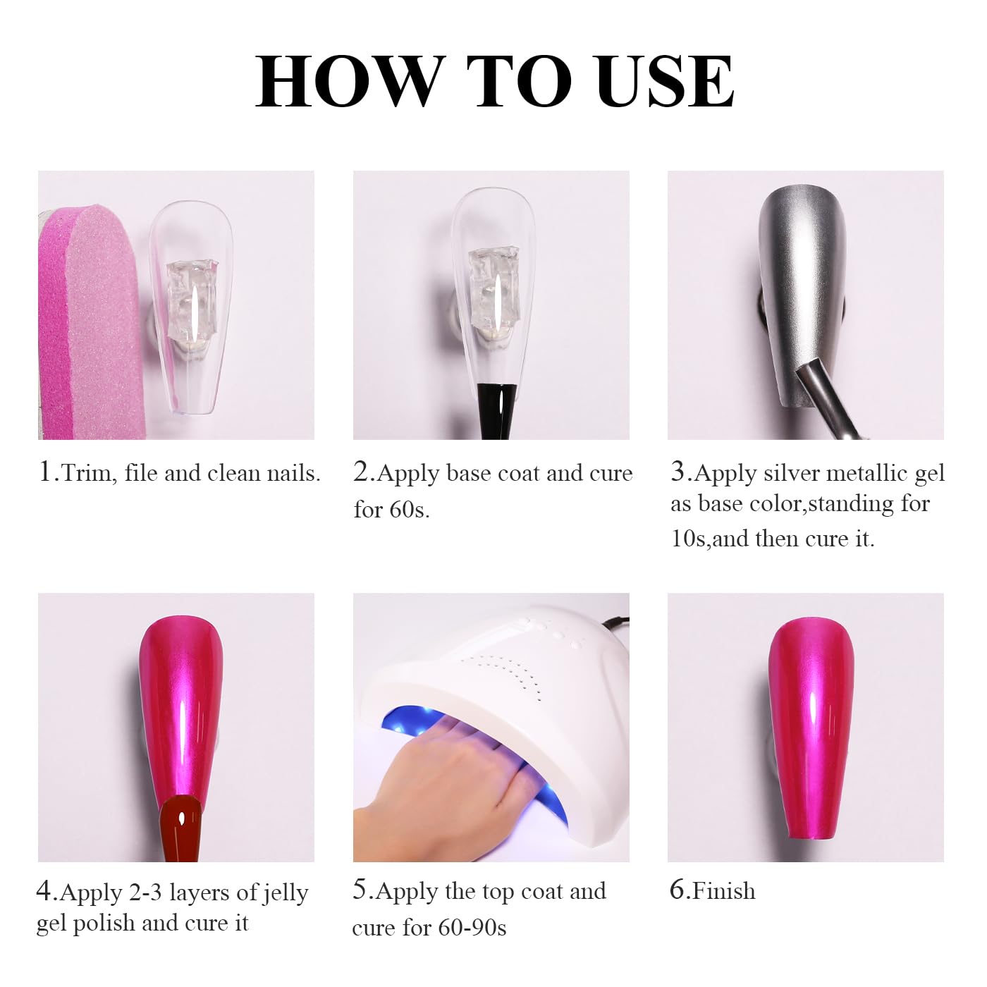 • Chrome Gel Nail Polish Kit:You'll get a bottle of metallic gel polish and a bottle of sky blue jelly gel nail polish.The shades are sheer, you can use it alone(no colored under coat) you get a sheer but spring summer color effect. If you apply with the metallic silver gel,you will sky blu colors highly shine chrome manicure.