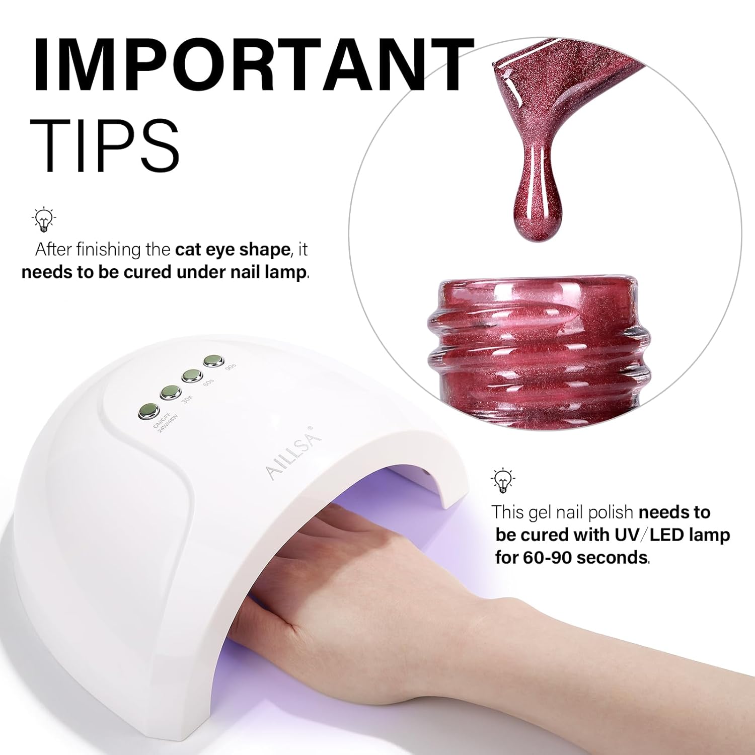 • Crystal Sparkle Effect: AILLSA cat eye gel polish creates mirror-like sparkle, crystal-clear nails, or vibrant cat-eye effects. Use it alone or pair it with any base color for stunning crystal glass nail designs featuring translucent tones and a dazzling finish.