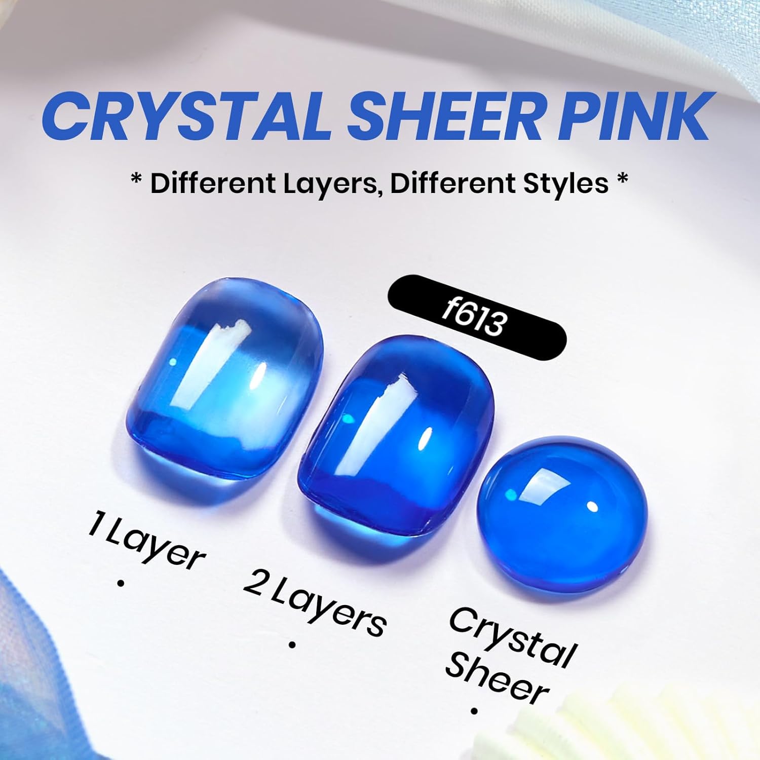 • 【Jelly Blue Sheer Gel 】Apply several layers to build up the color from clear translucent to solid opaque. Each layer, whether one, two, or three layers, creates a different effect. This jelly blue gel polish is UV gel and need to be cured 60-120s. (Note: It must be used with a base coat and top coat, which are not included and need to be purchased separately)