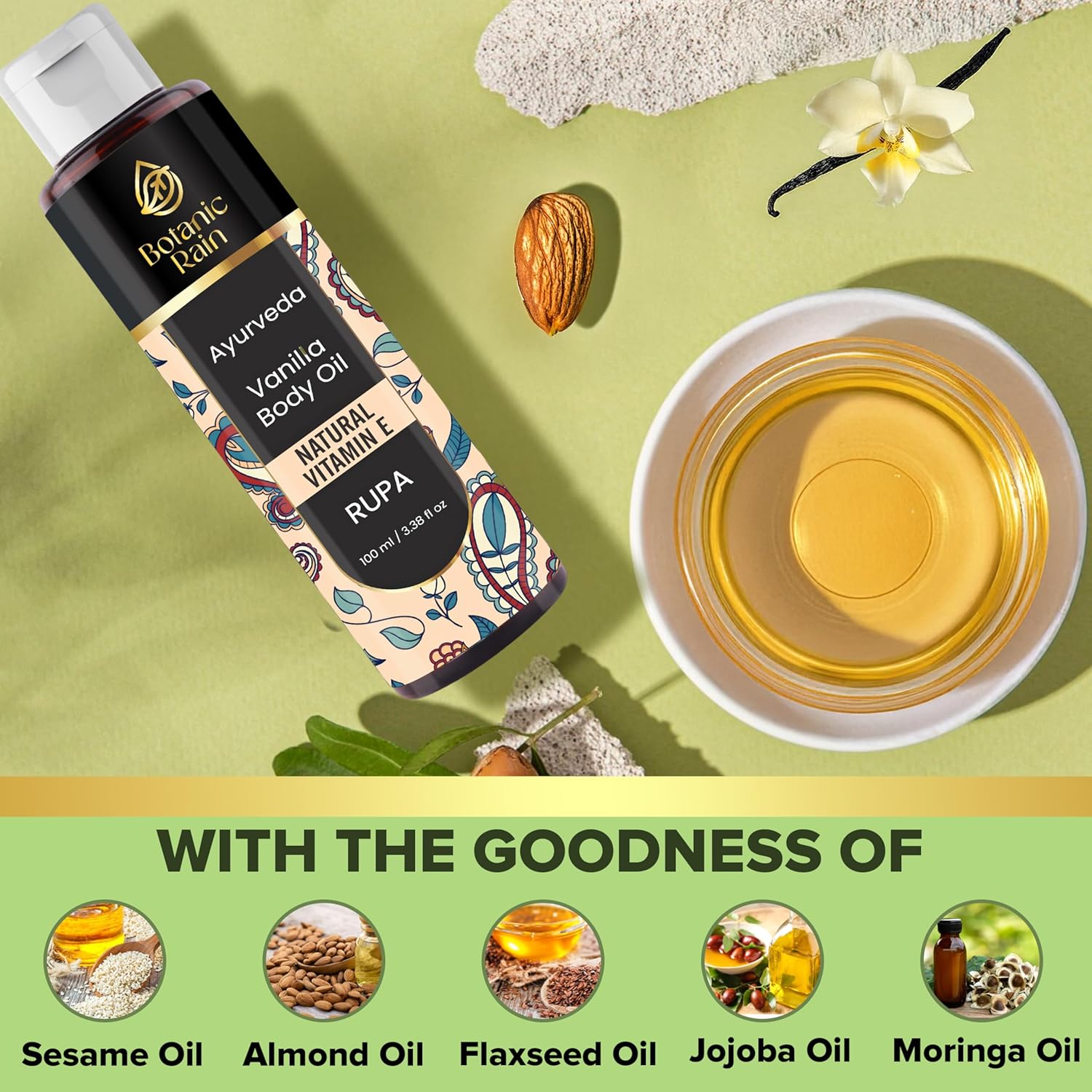 Ayurveda Vanilla Body Oil, Organic, Nourishing, & Hydrating Moisturiser for Dry, Flaky Crepey Skin - Fast Absorbing, Non-Greasy, Ayurvedic for Women & Men – 3.38 fl oz (2)