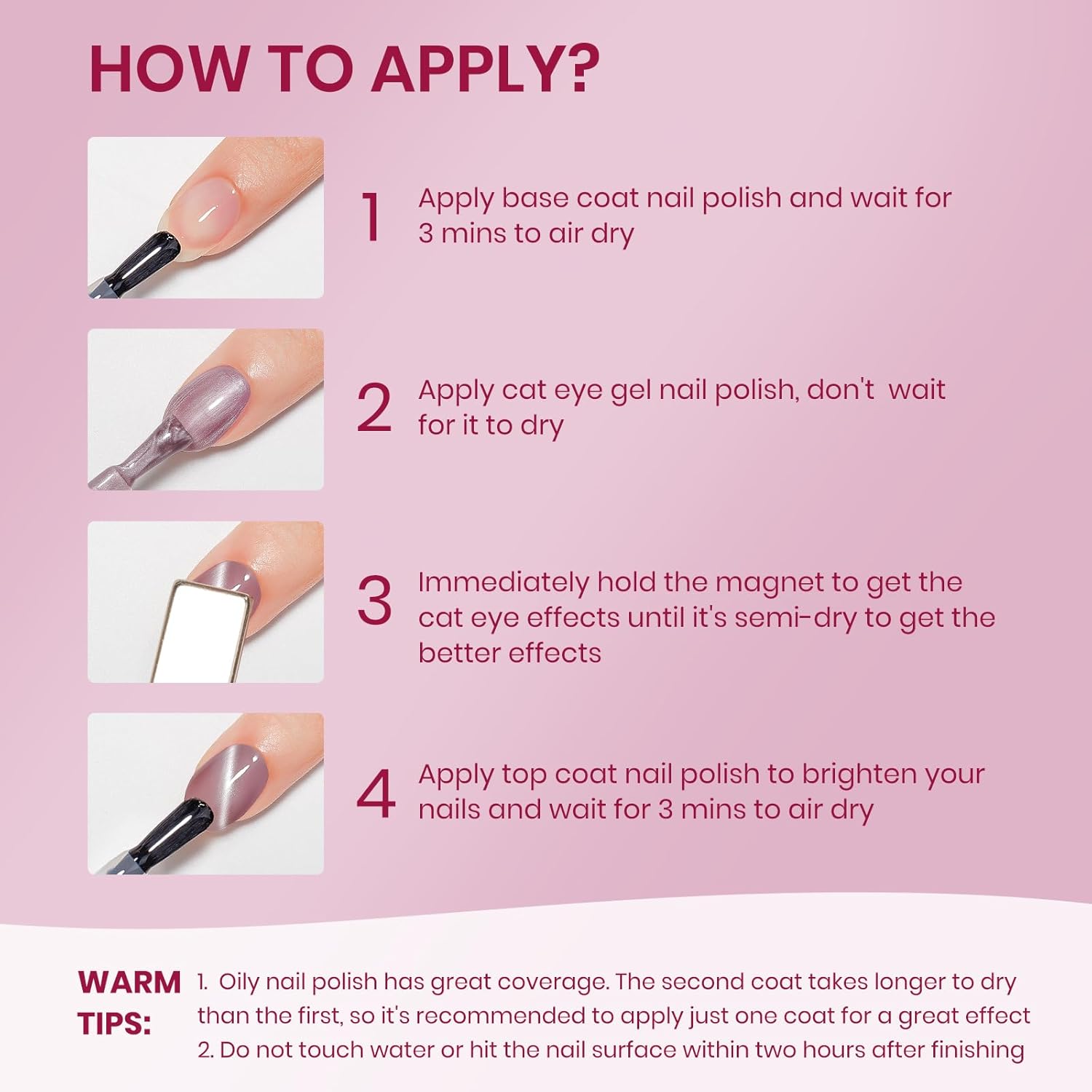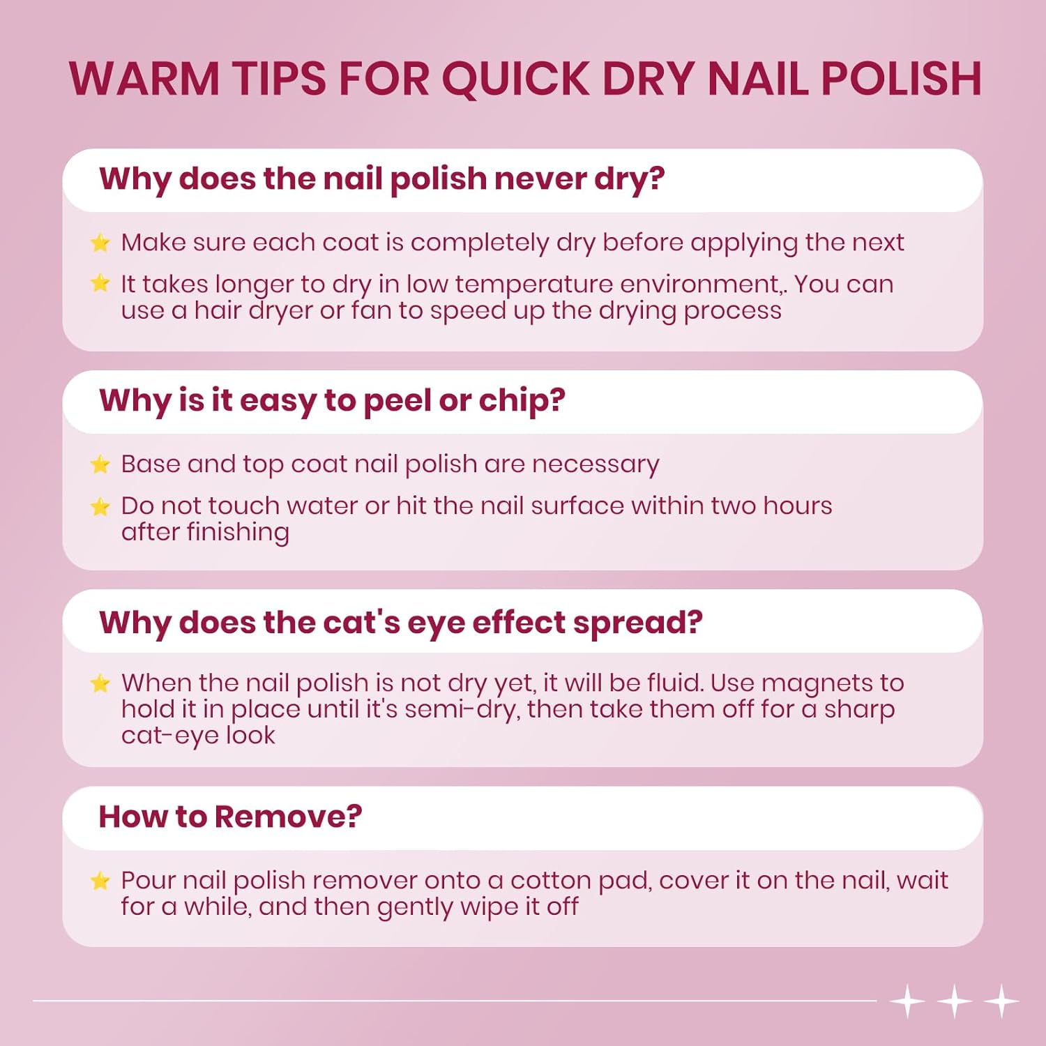 • Air Dry in Minutes: This Cat Eye Nail Polish dries quickly without the need for a lamp cure. It air dries in just 3 minutes for the first layer and 5-10 minutes for the second layer, making it perfect for those on the go