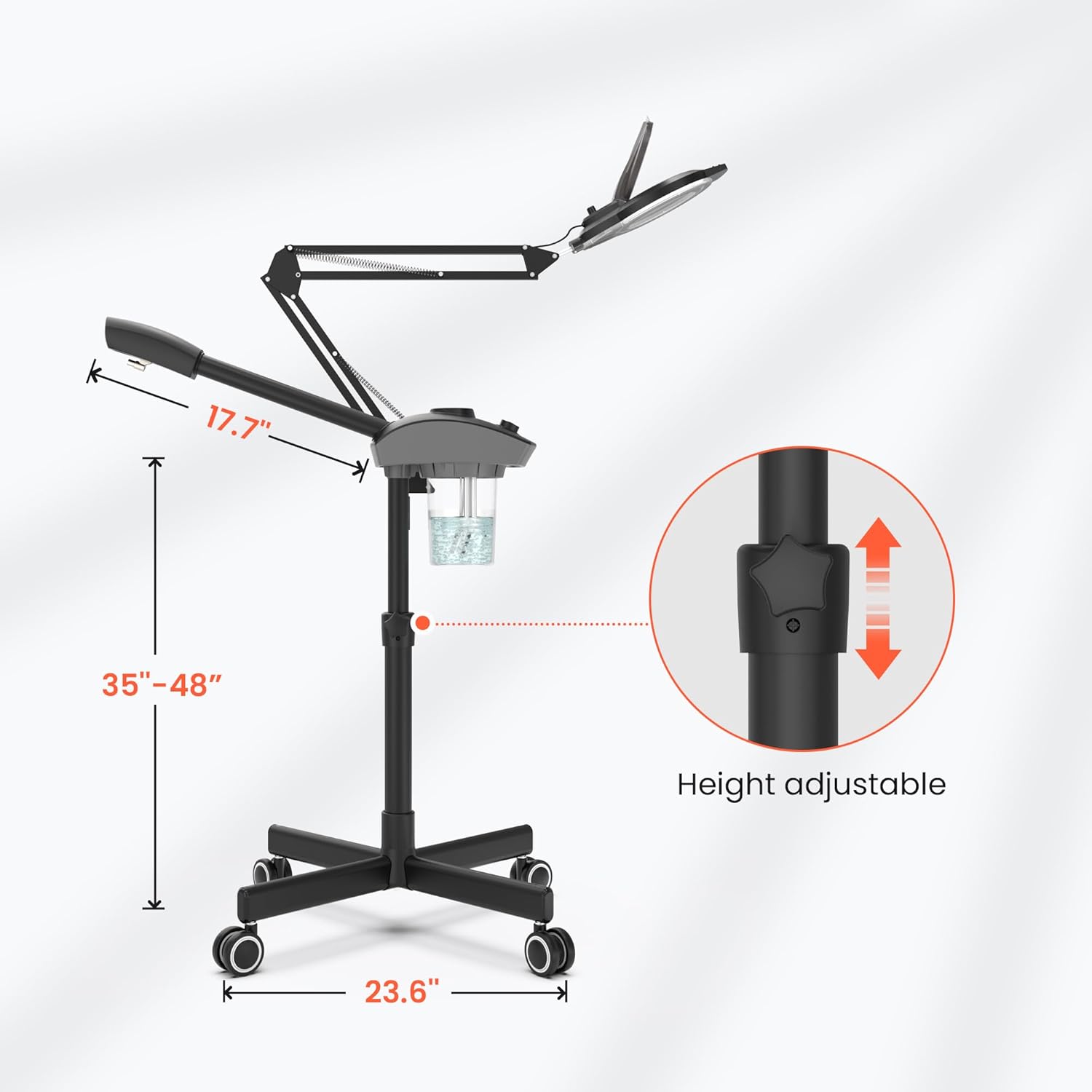 • Easy To Use:The facial steamer with 4 leg wheeled stable stand base that allows you to move around in the salon freely. The 360 degree rotating lens and 180 degree flip-up/down design allow personalized adjustments for an optimal skincare experience.