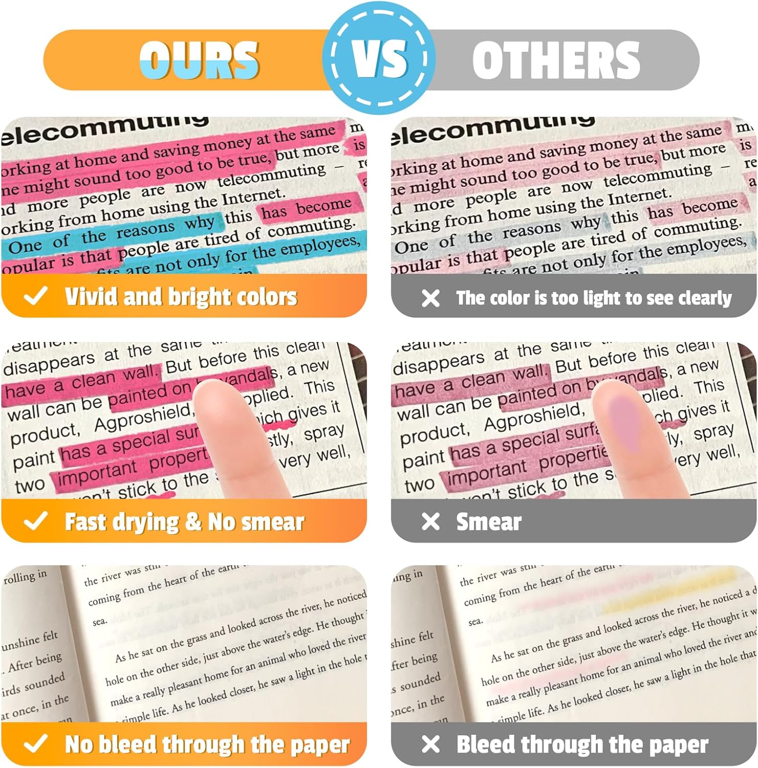 • No Bleed & Quick-Drying Highlighter: The highlighter pens use durable, quick-drying ink, allowing highlighted marks to be clearly visible without worrying about the ink staining your hands and books. Even when highlighting on one side of the page, the opposite side remains fully legible, eliminating the concern of ink seepage that could impair readability.