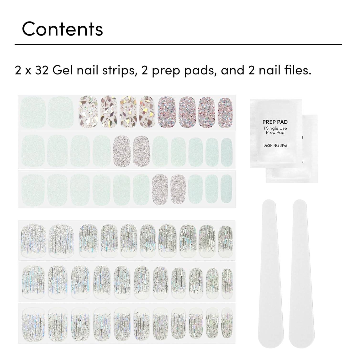• Includes: 2 x Gel Strip Sets. Each set includes 32 gel manicure strips (20 base color, 12 accent), 1 prep pad, 1 nail file. Easily remove nail strips with nail oil or acetone