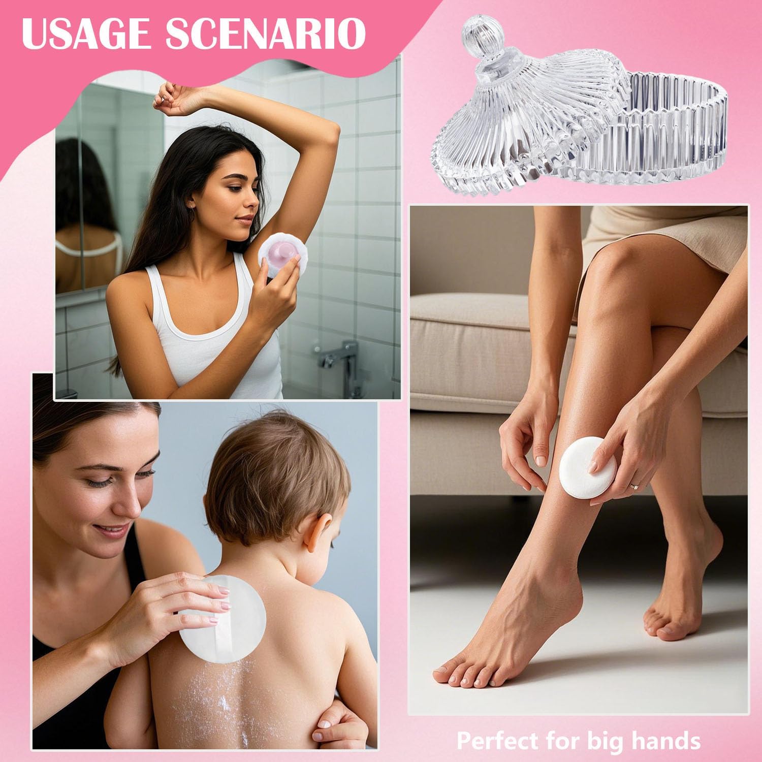 • 【Stylish Body Puff and Container】The container has an enlarged opening for easy access to the body puff, thick glass for long-lasting durability, and a flat base ensuring stable placement. Its European classic design, adorned with carved textures, looks great. The lid and container have a tight, gear-like fit (not sealed). The top-knob simplifies opening and closing. It's easy to clean and multi-functional.