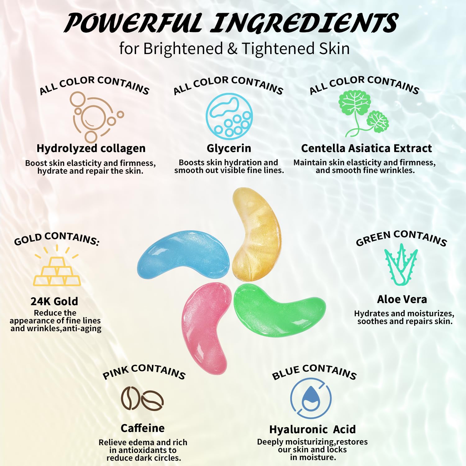 • Safe & Effective Ingredients: Our under-eye patches are infused with a powerful blend of collagen, hyaluronic acid, caffeine, and natural plant extracts which work together to deeply repair, soothe, rejuvenate, and protect the delicate skin around your eyes — without any irritation. The ingredients of our under eye patches for dark circles and puffy eyes are vegan, sulfate-free, and gentle on all skin types.