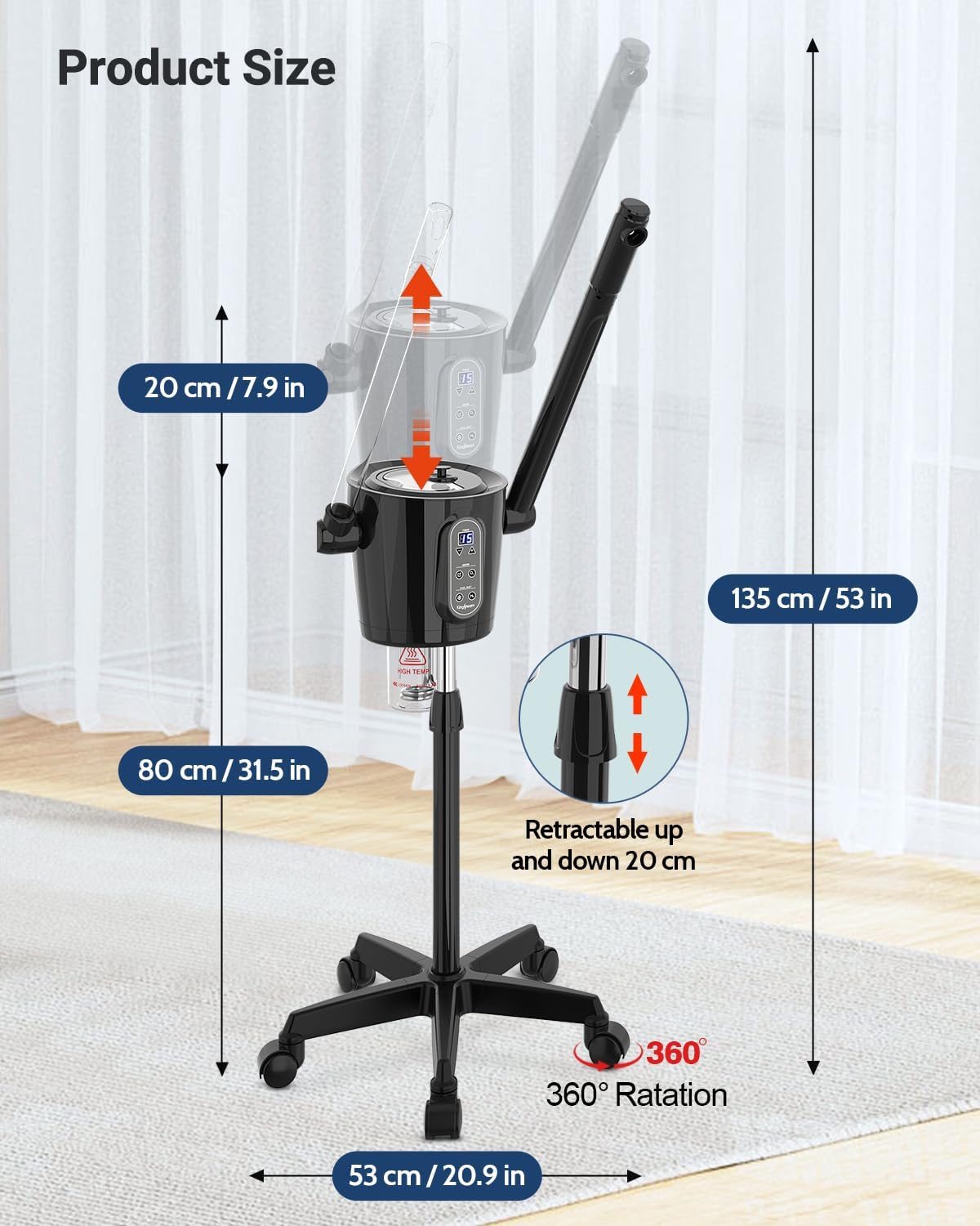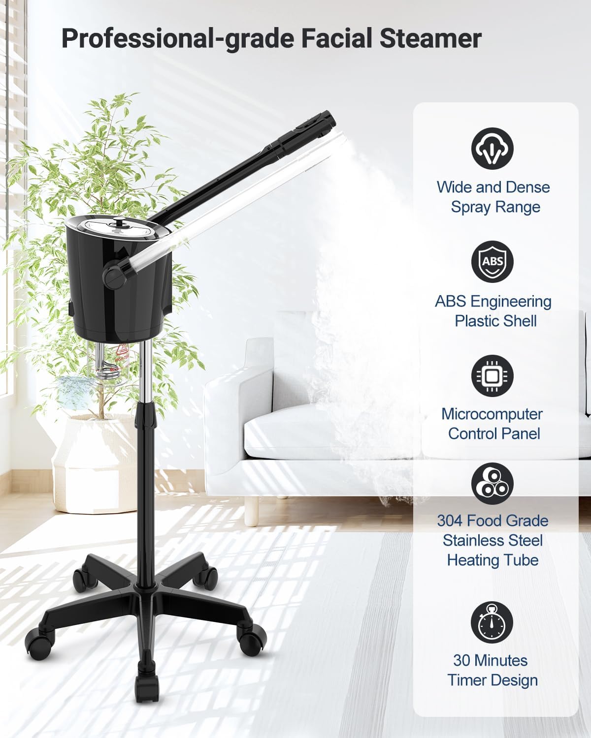 • [Practical & Easy-to-Use Design] The Kingsteam facial steamer features a 360° rotating nozzle, adjustable arm, and height-adjustable mobile stand with a telescopic tube, designed to accommodate your different needs and settings. Whether sitting or lying down, you can easily enjoy spa treatments for your face and neck. The detachable water cup is simple to clean, and we recommend changing the water regularly for optimal performance. The stable, mobile stand with wheels allows for easy movement and secure positioning