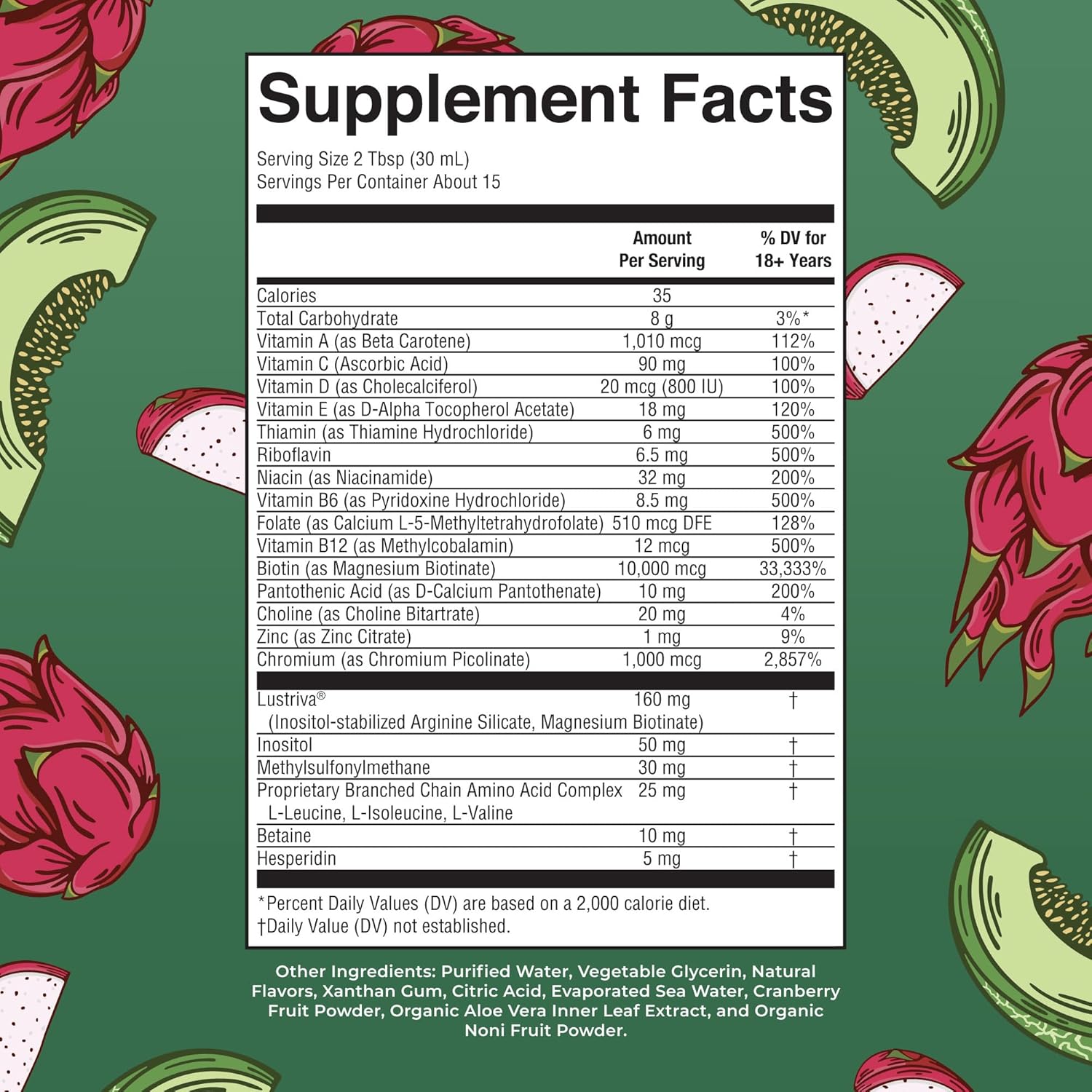 • WOMEN HAIR GROWTH SUPPLEMENT: Enjoy this delicious liquid multivitamin in a peach mango or dragon fruit melon flavor and receive all of these nutrients plus Lustriva for thicker, fuller hair in women with just two tablespoons per day!