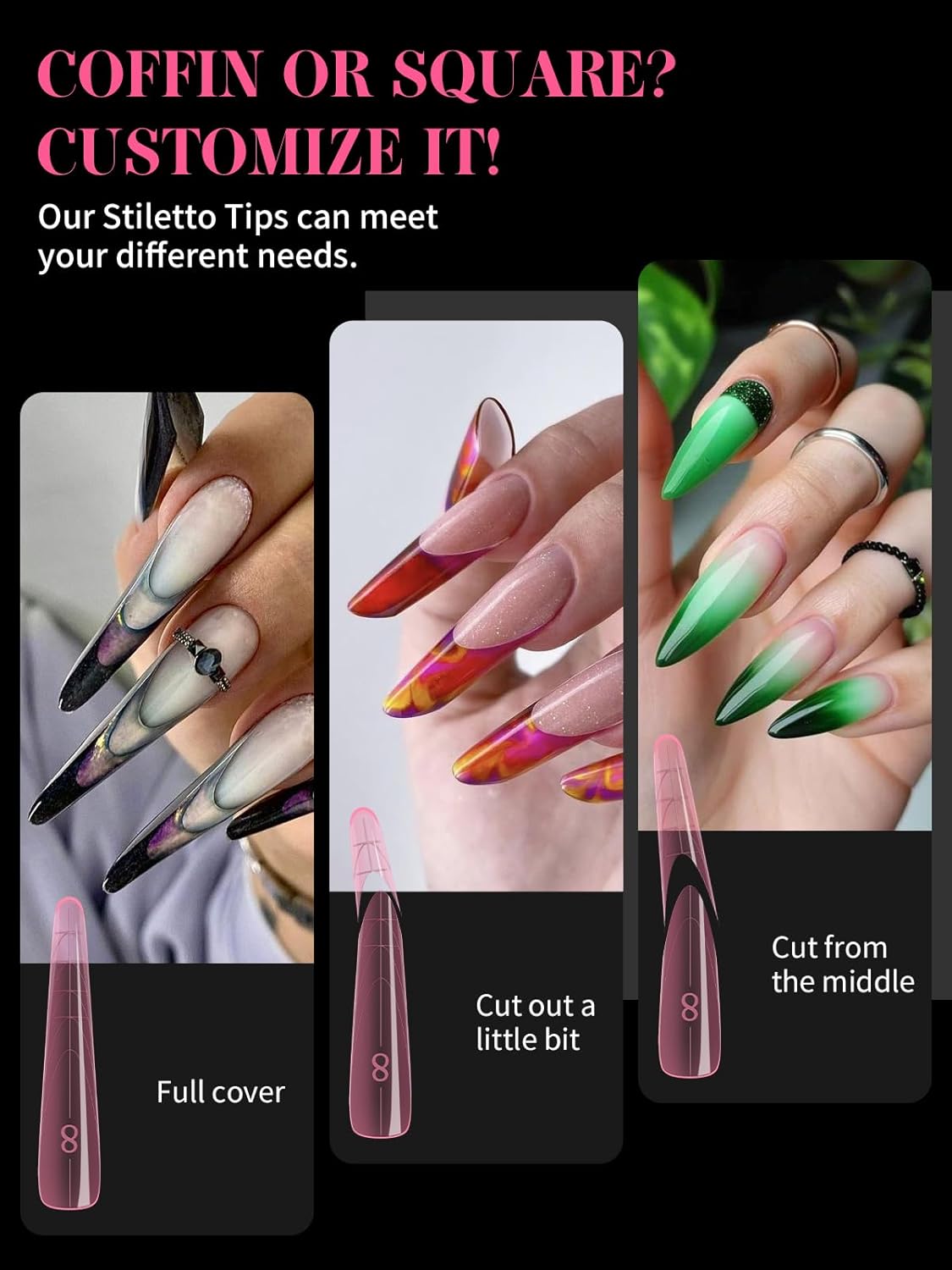 • 【Nail Form Mold with 15 Sizes】150pcs stiletto clear dual forms for poly nail gel offers 15 different nail sizes , and each size of long nail tips is separated by a small grid, a total of 15 grids, so they're easy and convenient to choose the suitable size to meet your nail's need.