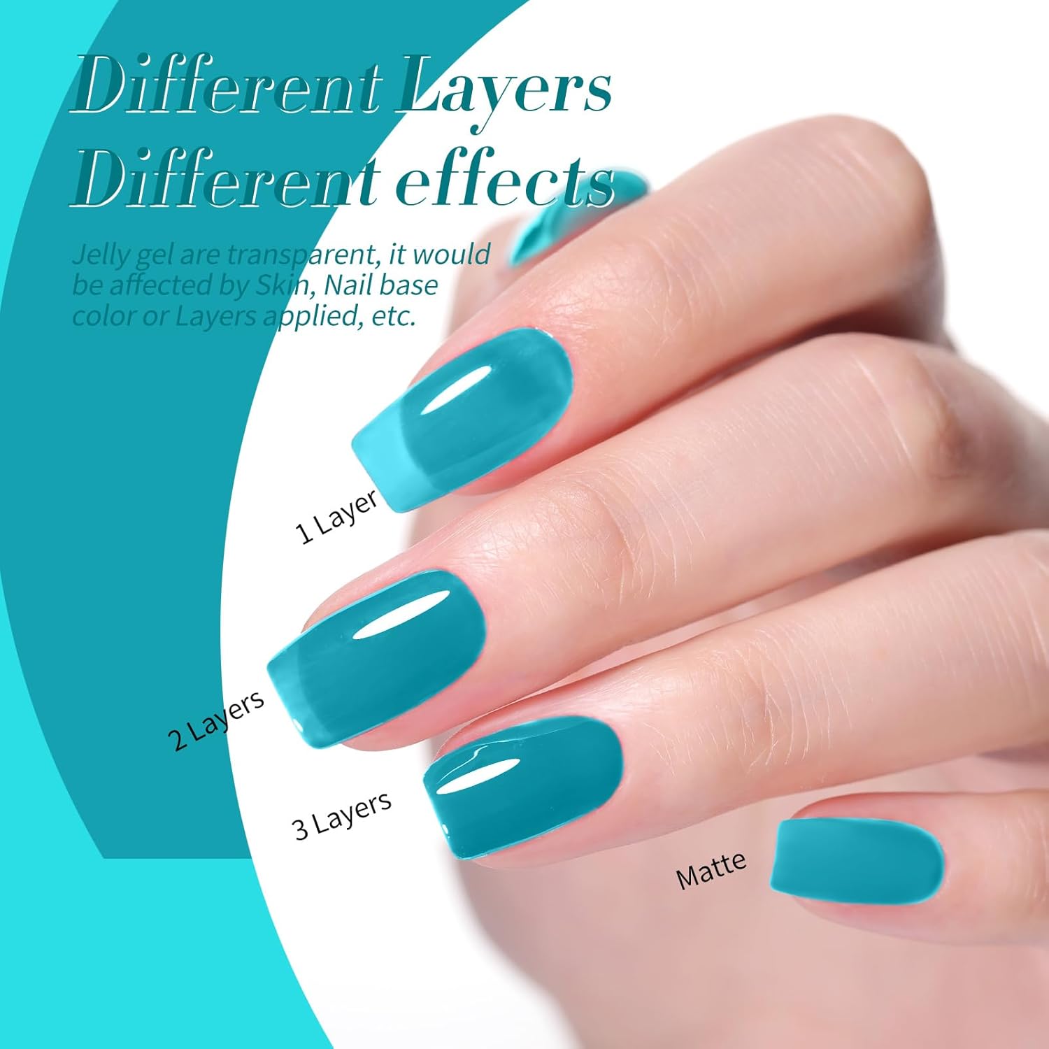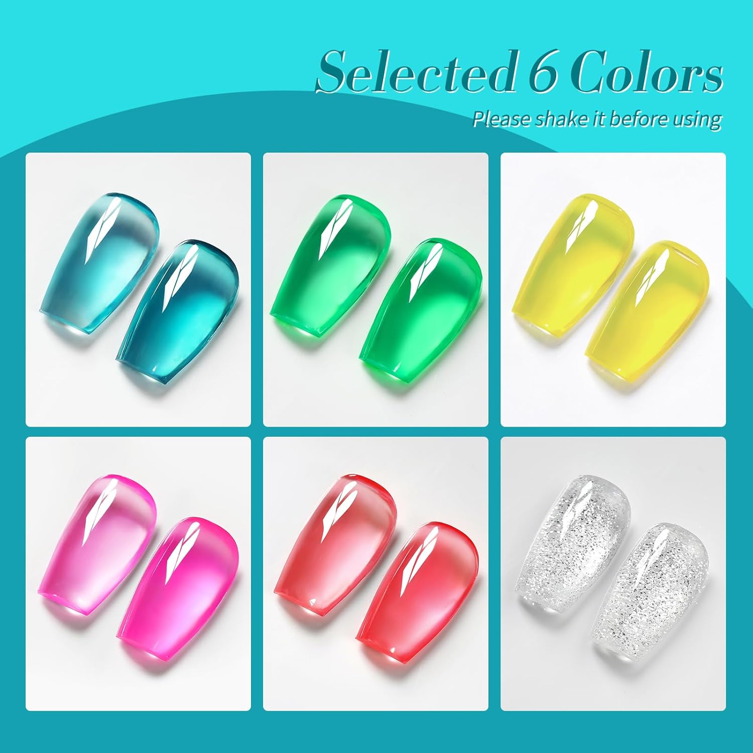 Born Pretty Jelly Gel Nail Polish Set Spring Summer Crystal Glass Translucent Pastel Sheer Gel Polish Pink Green Blue Red Yellow Silver Shiny Glitter Gel Nail Polish Nail Art Gel DIY Gift 6PCS