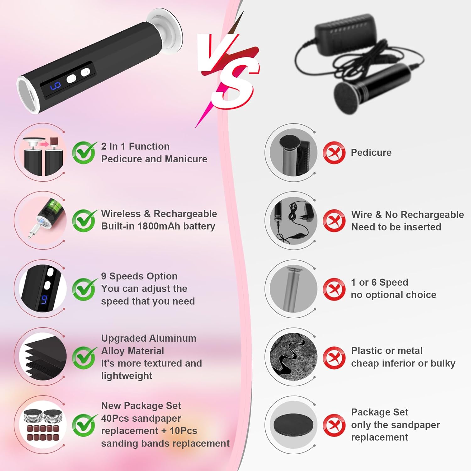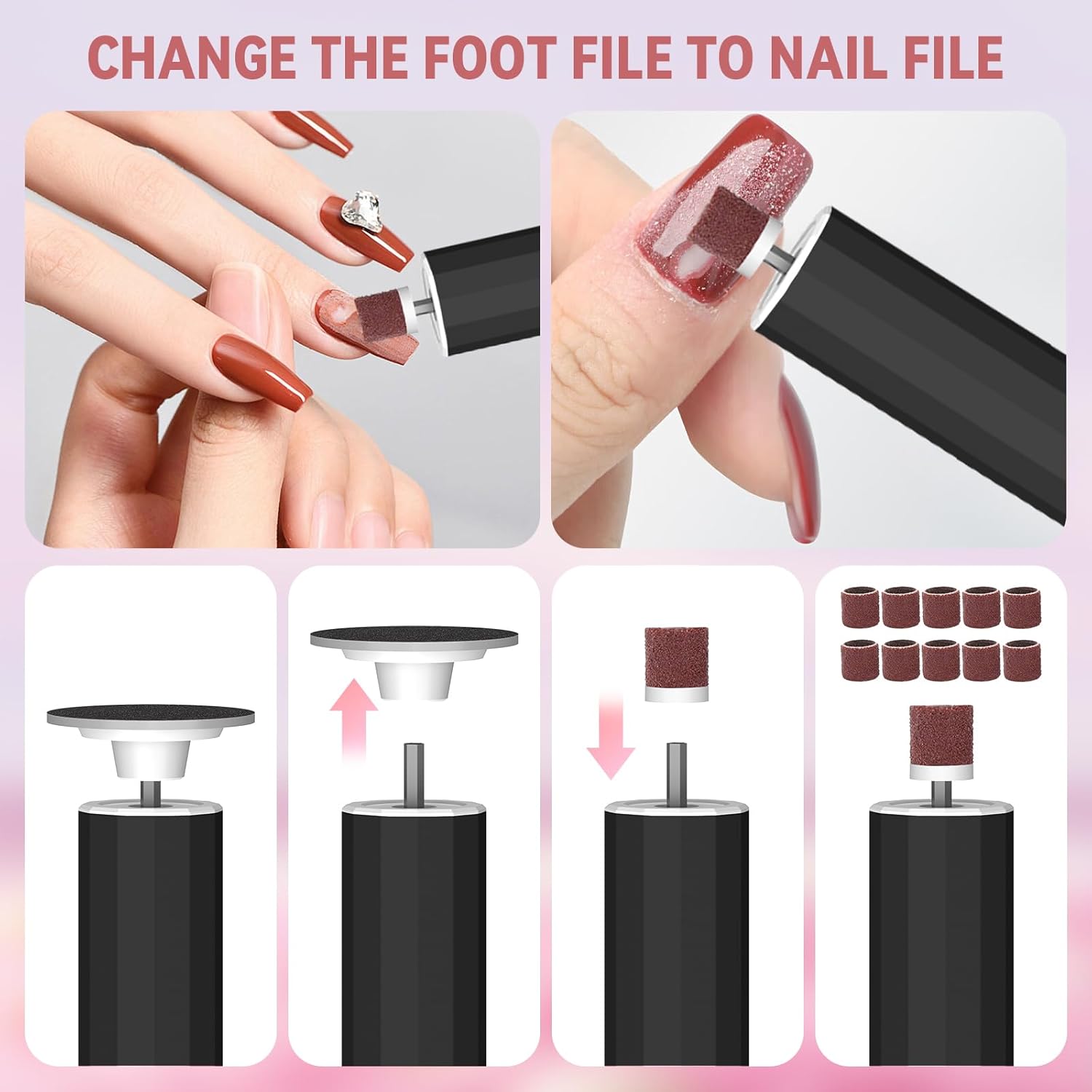 • 【WHY CHOOSE OUR LATEST FOOT SCRUBBER】More Convenient- this is 2-in-1 nail and foot scrubber, for both foot & hand care. More Gentle - compared to traditional foot grinding tools, it prevents over-grinding or bleeding, ensuring a safer experience! More Hygienic - one sandpaper for per person offering a more hygienic solution! More Efficient - Designed with the latest ergonomic features, this foot file offers adjustable speed settings and clockwise/counterclockwise rotation, making it faster