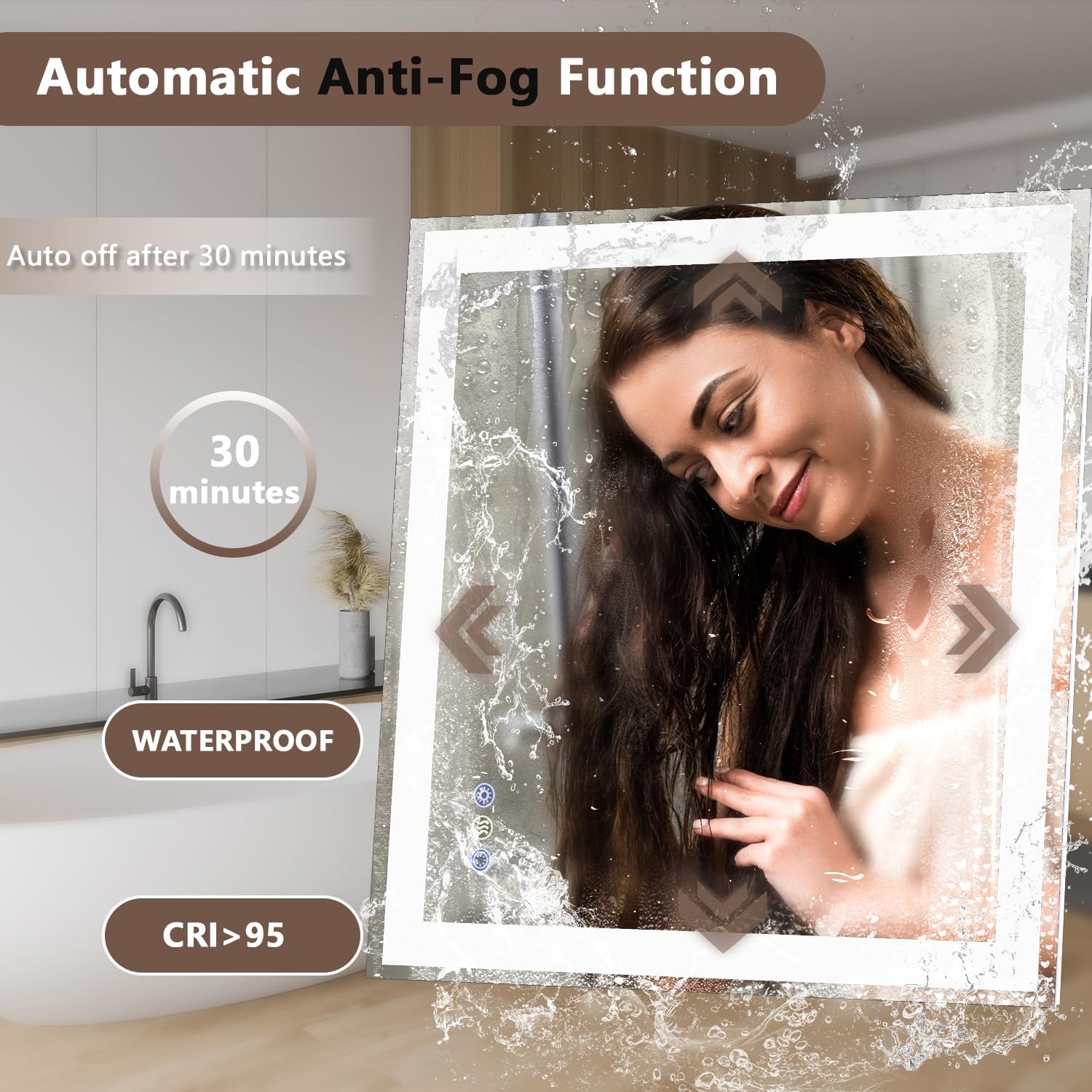 • 【Sealed Design, Waterproof & Moisture-Resistant】Fully sealed and IPX4+ rated, this mirror is specially built for humid spaces. It features certified waterproof components and grounding protection to prevent electric shock from leakage-safety you can trust. 196 LEDs/m and CRI>95 provide bright, uniform, and soft lighting without flicker or dark spots. Designed for bathroom safety but also perfect for bedroom, salon, or entryway-offering better protection and performance than standard mirrors