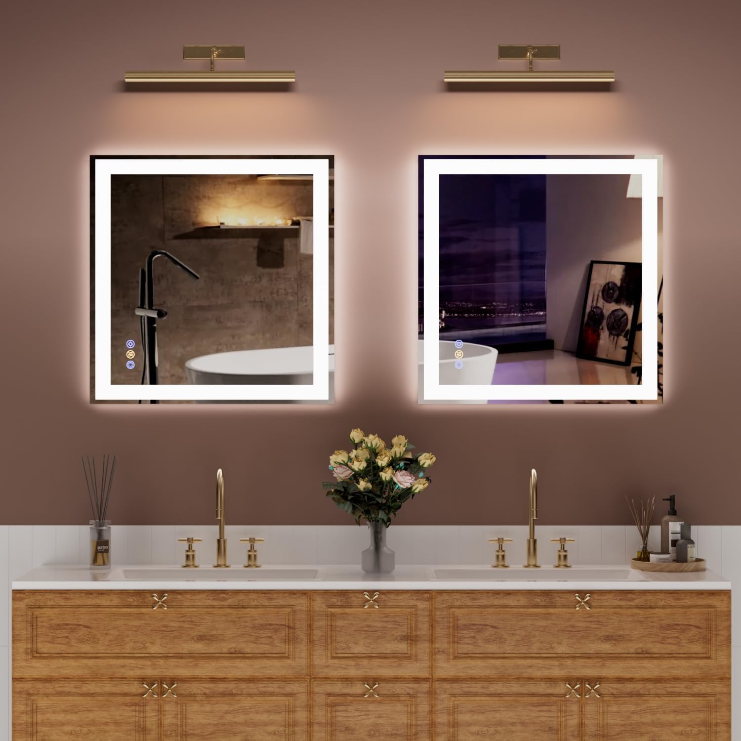 • 【Separate Front & Backlit Control with Dimming】This LED bathroom mirror features 3 adjustable color temperatures (3000K / 4000K / 6500K) and dimmable brightness (10%–100%). Front and back lights can be controlled separately. Short press to switch color temperature and turn lights on/off. Long press to adjust brightness. Unlike most mirrors, our button light can be turned off — no more glowing at night