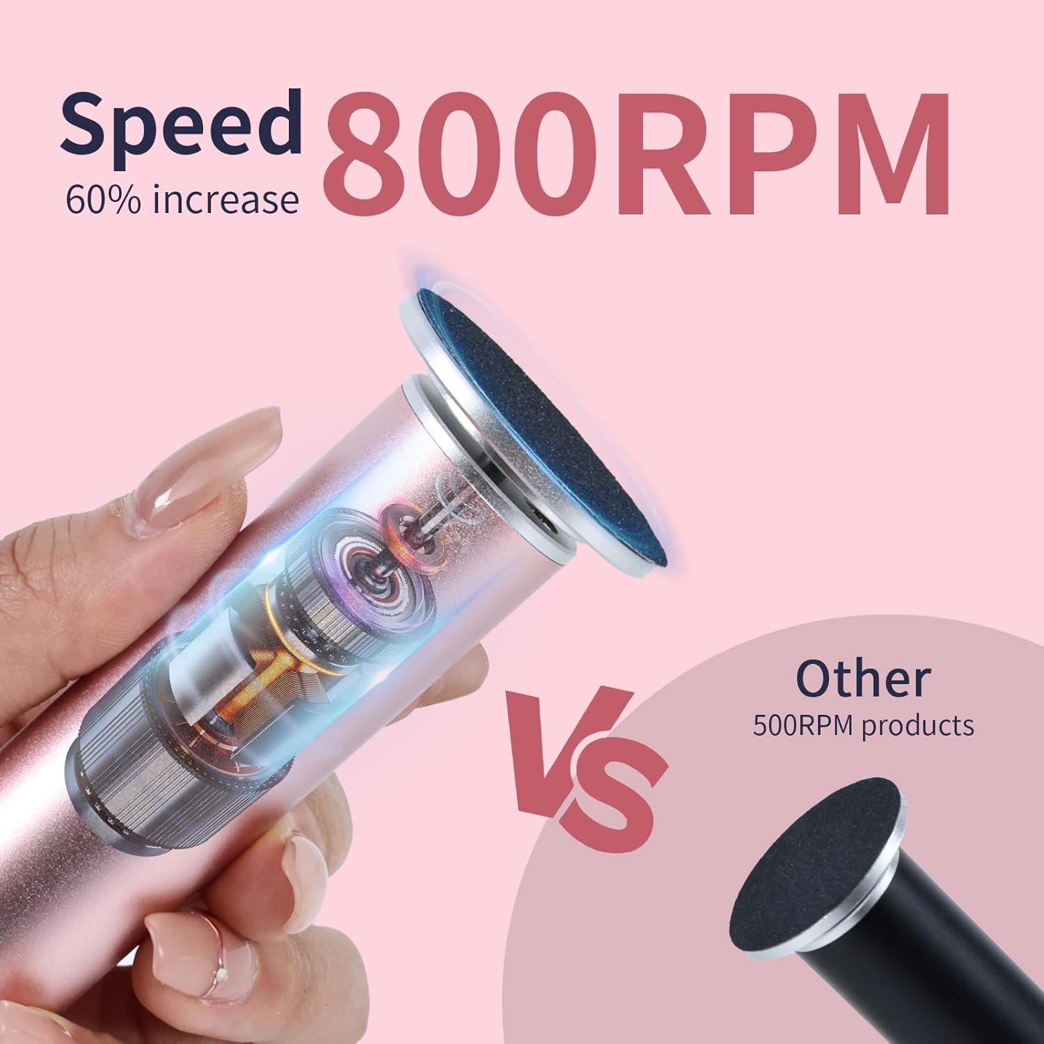 • Upgraded Stepless Adjustable Speed: The electric foot filer offers precise control over rotational speed, with a maximum of 800 RPM—60% faster than the 500 RPM of other models—allowing for more efficient removal of calluses