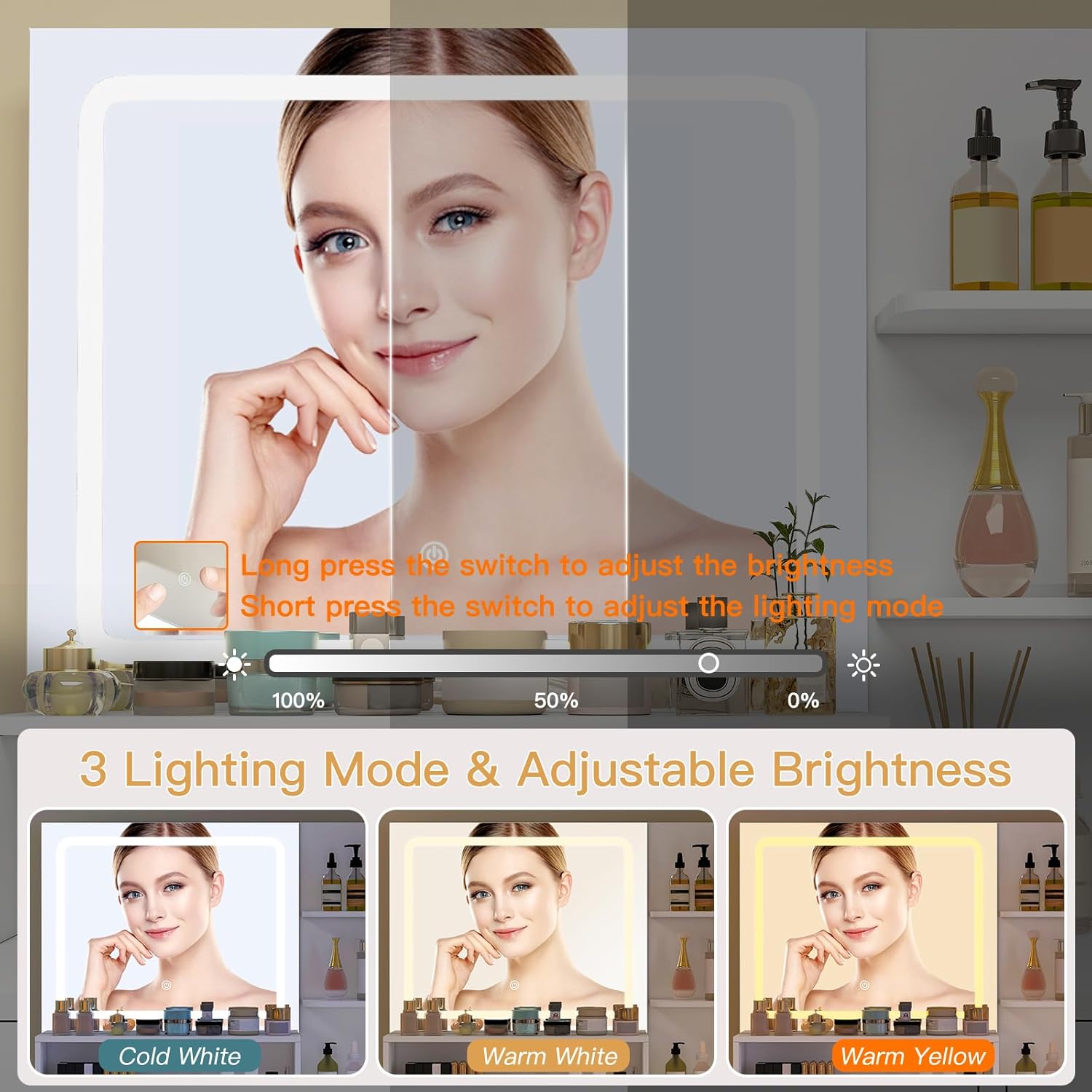 • 【See Yourself Beautifully In the Mirror】Now you never have to worry about having inadequate lighting when applying makeup! The vanity table features 10 LED light bulbs with 3 color modes(cool white, warm white or warm yellow), and the brightness of each color of light can be adjusted to meet your needs for different brightness when applying makeup