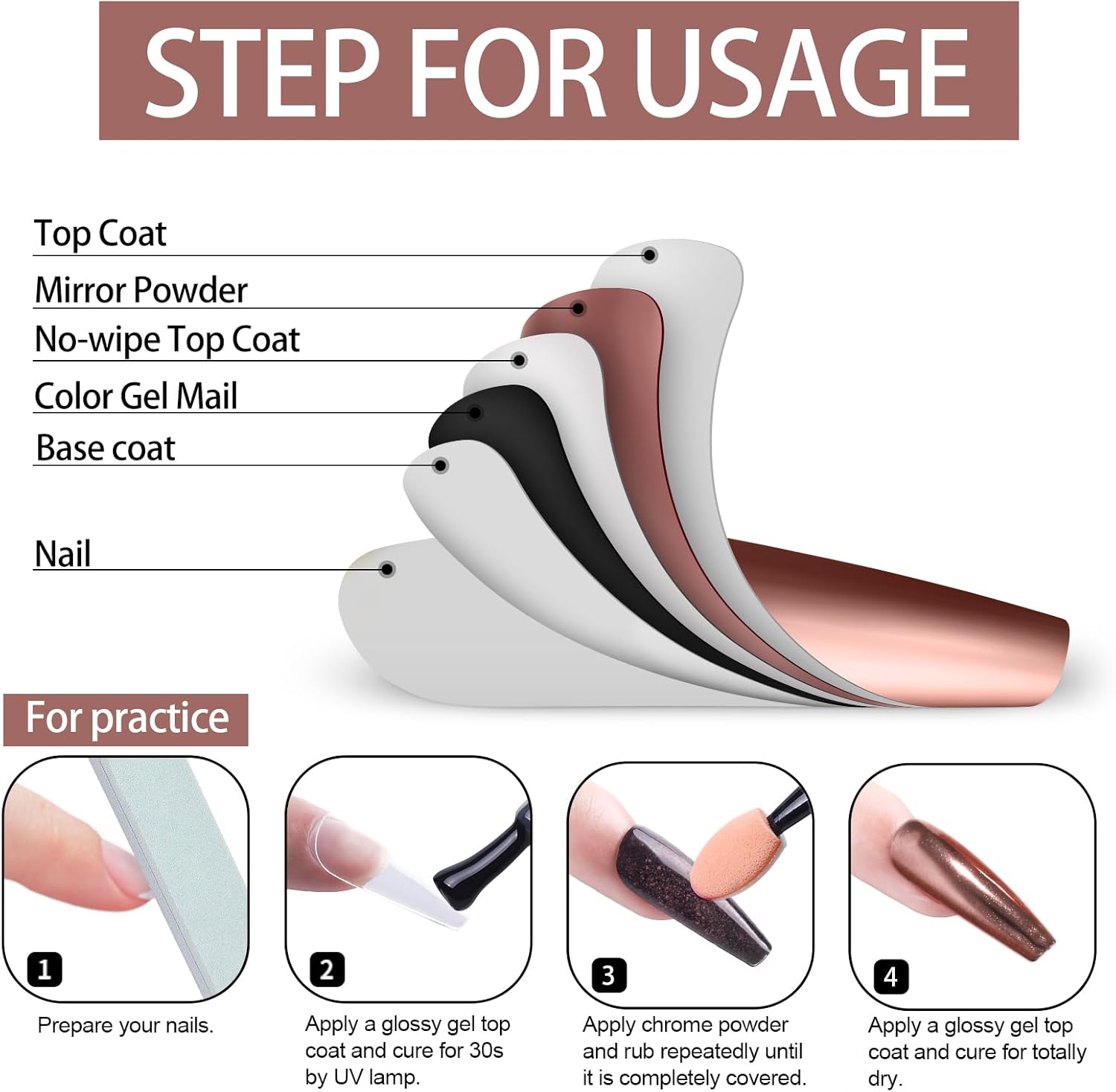 • The Scope Of Application:All chrome powders should only be applied to glossy No wipe top coat to embellish Nail-Polishes color. Otherwise it is unusable, it can't be applied directly to the nail, and it can't be applied directly to the skin. Artdone chrome powder can be applied on UV gel nails, acrylic nails or false nail tips. You can use them very easily