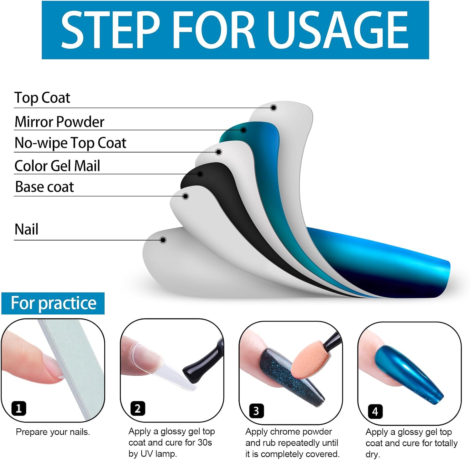 • The Scope Of Application:All chrome powders should only be applied to glossy No wipe top coat to embellish Nail-Polishes color. Otherwise it is unusable, it can't be applied directly to the nail, and it can't be applied directly to the skin. Artdone chrome powder can be applied on UV gel nails, acrylic nails or false nail tips. You can use them very easily
