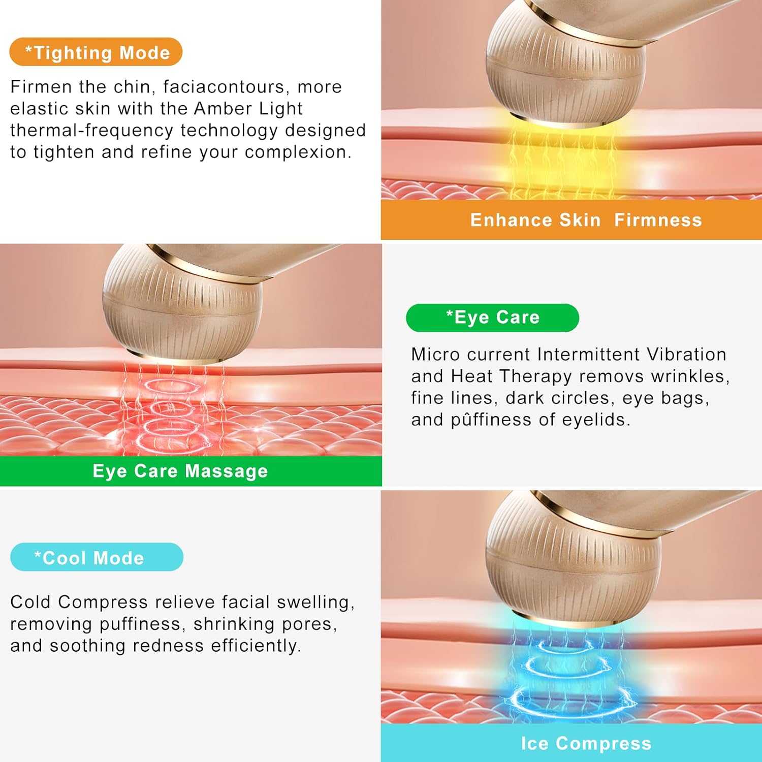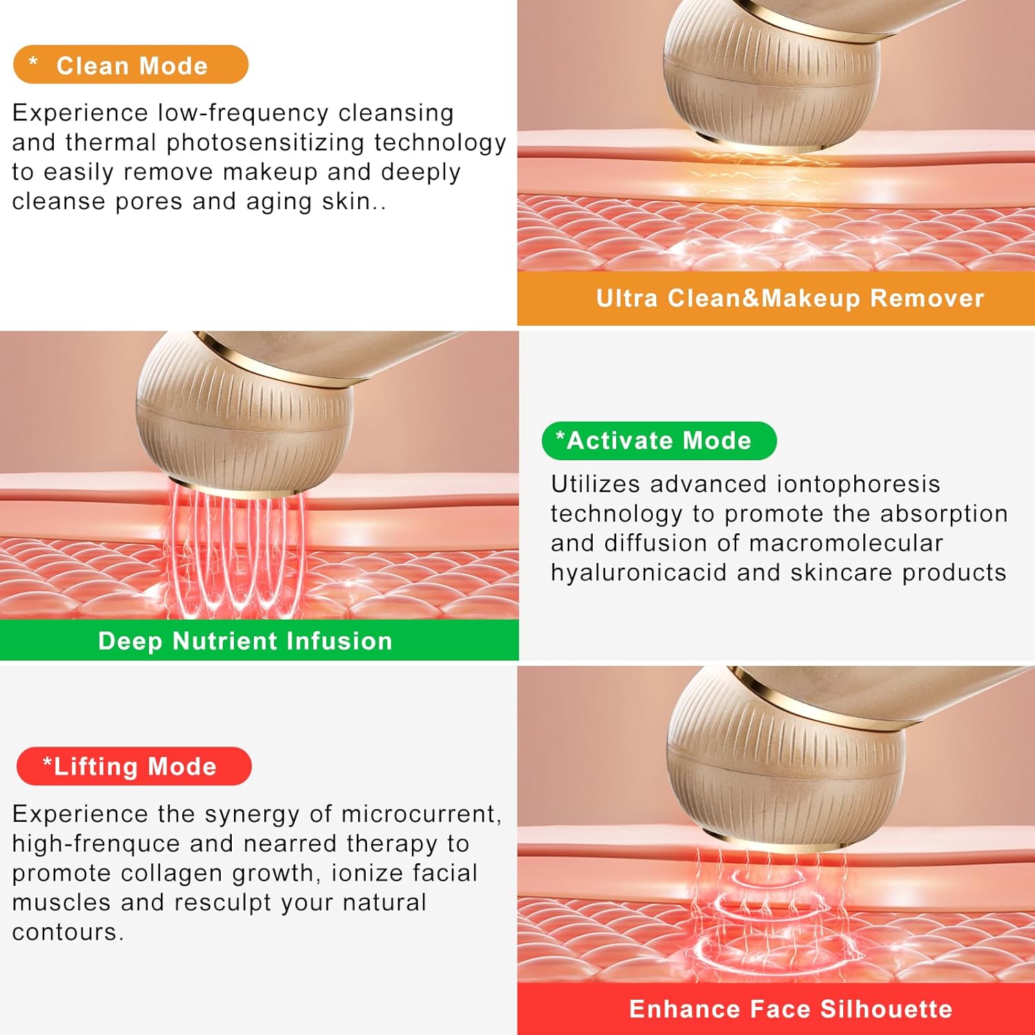 • 【Spa-Level Hydration & Lifting System:】Dynamic Microcurrent + Red Light Fusion – Morning: Use cooling blue light (4°C) to depuff eyes & shrink pores Night: Activate RF+red light combo for overnight collagen renewal Pre-Event: 5-minute microcurrent lift for instant V-face effect