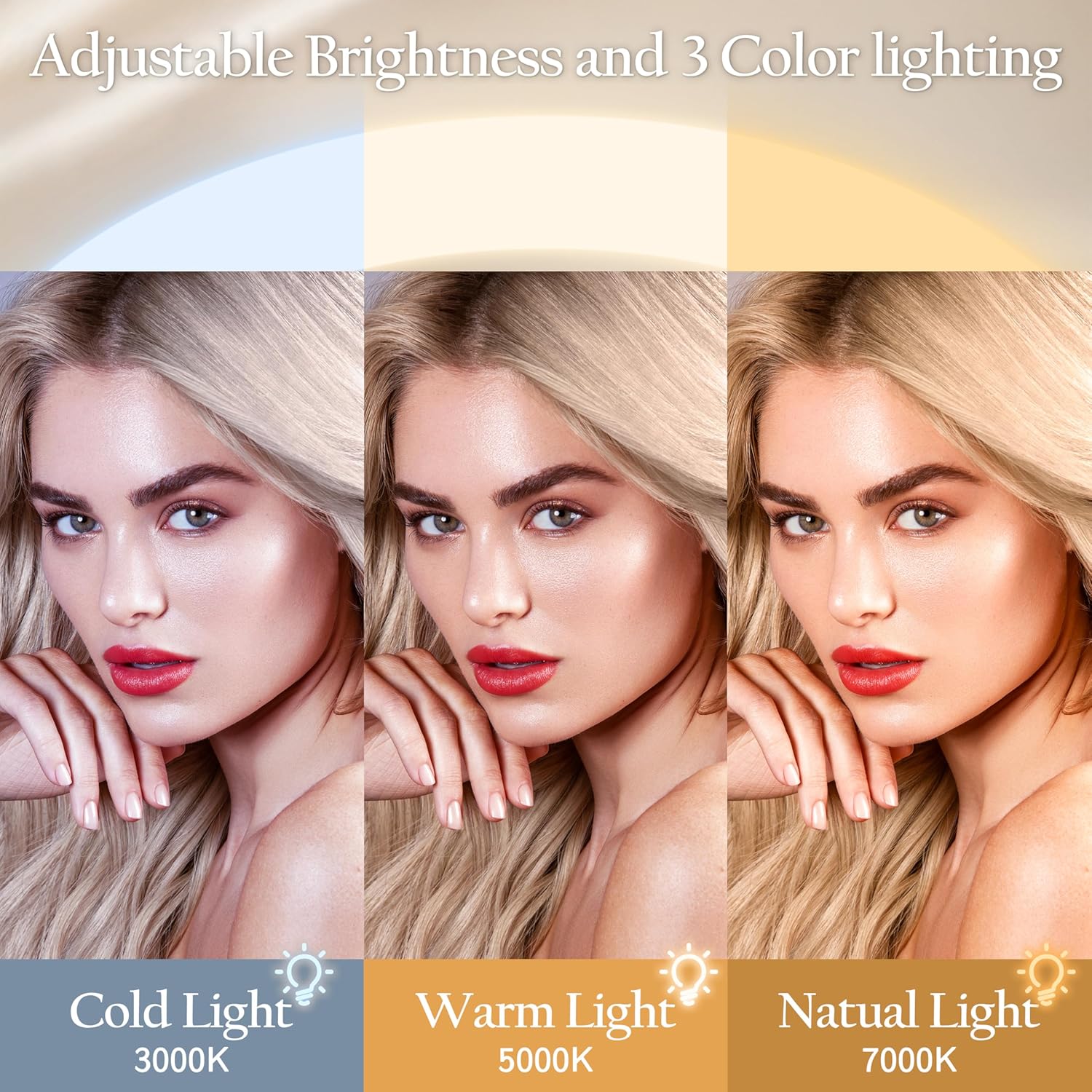 • 【3-Color Lighting & Stepless Dimming】Featuring three adjustable color settings (Cool White, Warm White, Natural White) for diverse makeup environments. Effortlessly slide your finger for precise brightness control (0-100%), ensuring shadow-free, even illumination every time.