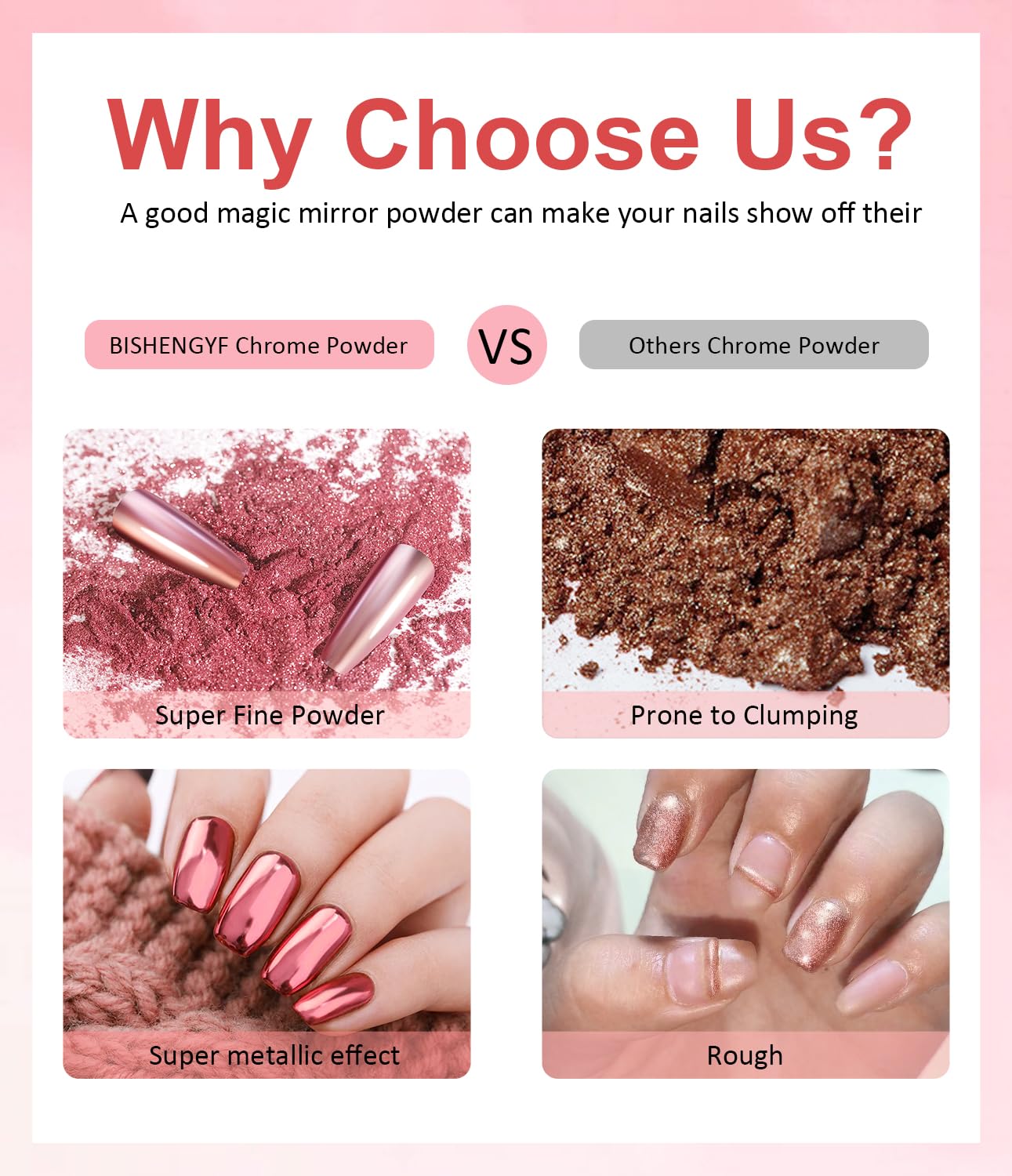 • Upgrade Nail Glitter Powder : BISHENGYF chrome powder for nails is made of synthetic resin and non-toxic. The aurora chrome nail powder is fine with attractive luste. Our crome nail powder has a great holographic and pearlescent effect.