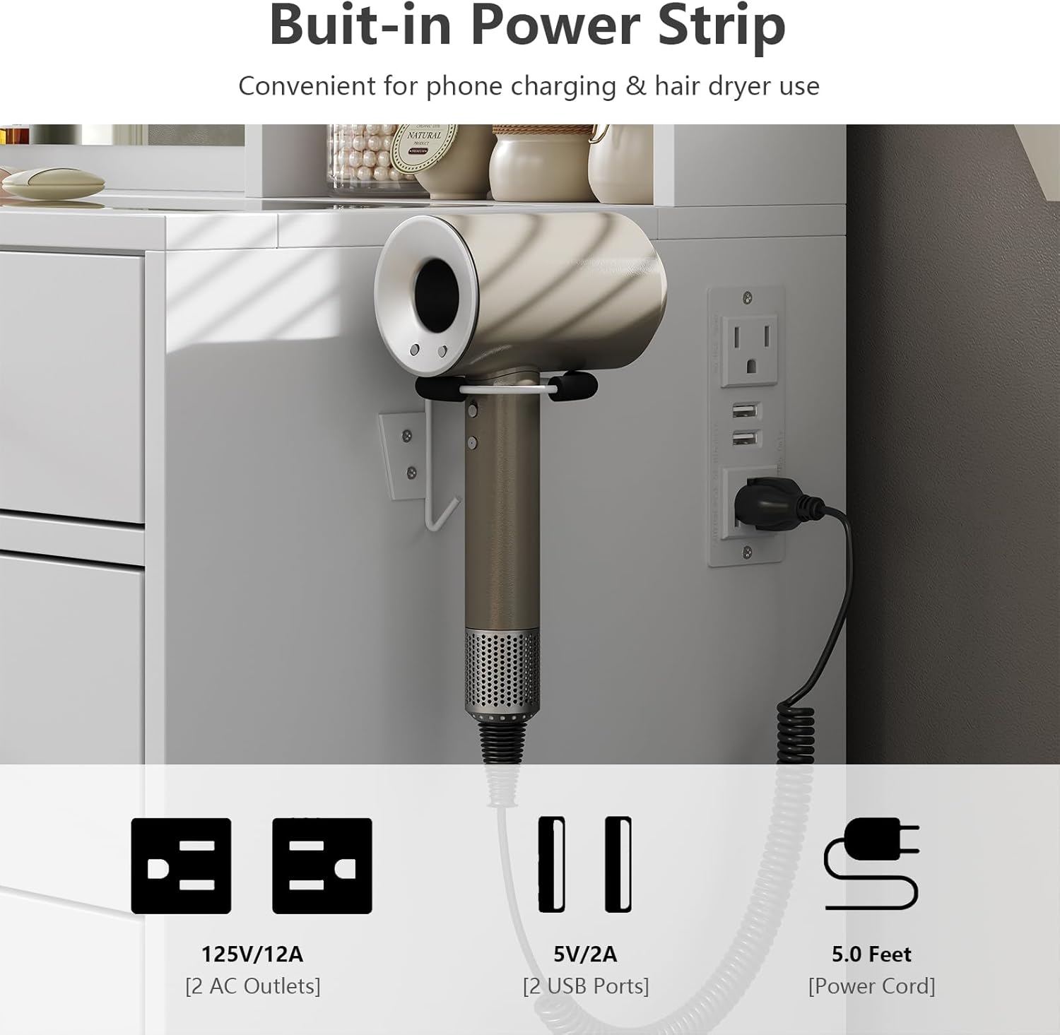 • Vanity Table with Charging Station: This Vanity comes with a hair dryer stand and charging station, including 2 standard plug sockets and 2 USB ports to connect your hair dryer, curling iron, computer, Ipad, mobile phone, allowing you to take beautiful selfies after applying makeup