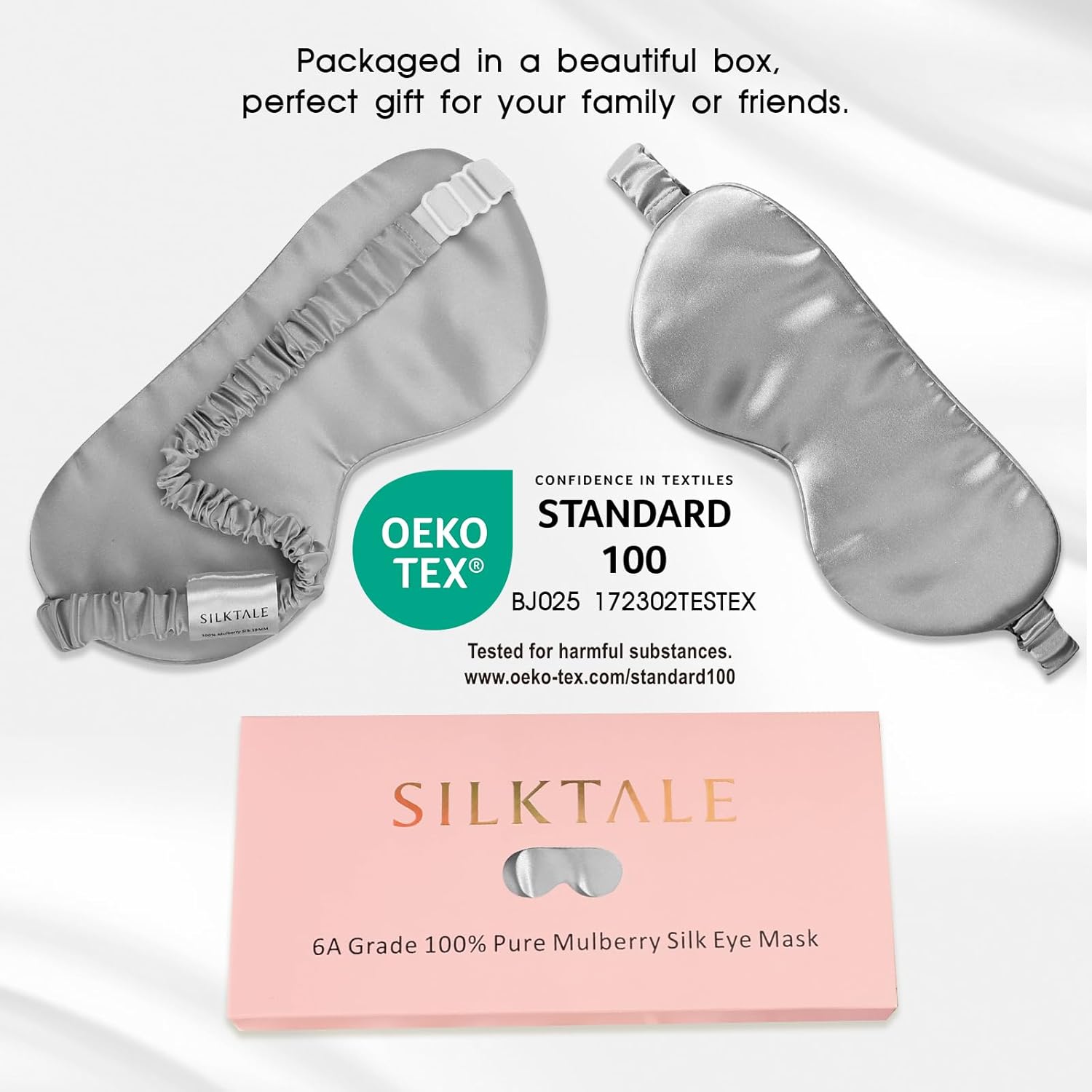 • SILKTALE sleep eye mask is made of 100% Grade 6A 19 momme Pure Mulberry Silk. Our silk is granted the OEKO-TEX STANDARD 100 certification, which is certified to be free of chemicals and colored with environmentally-safe dyes.