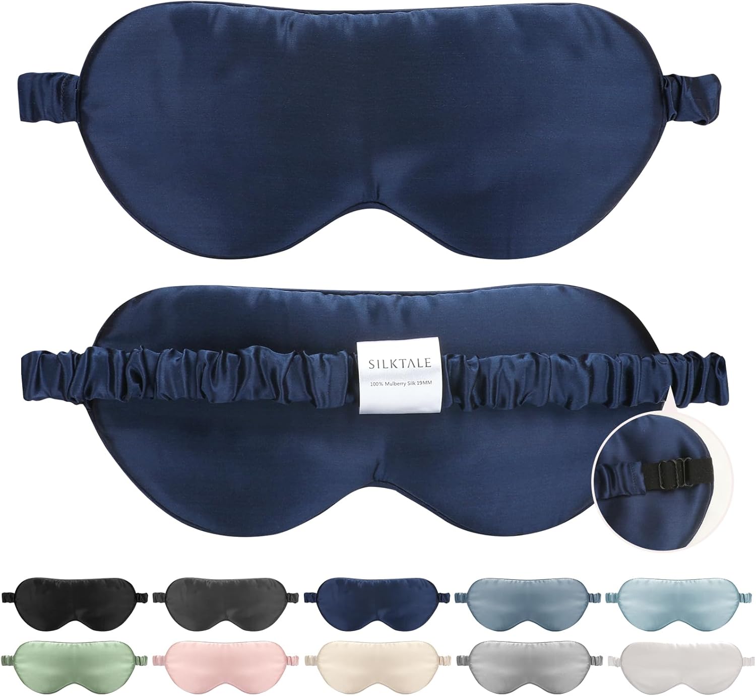 Mulberry Silk Blackout Adjustable Sleep Eye Mask for Men/Women Travel Plane,Navy Blue