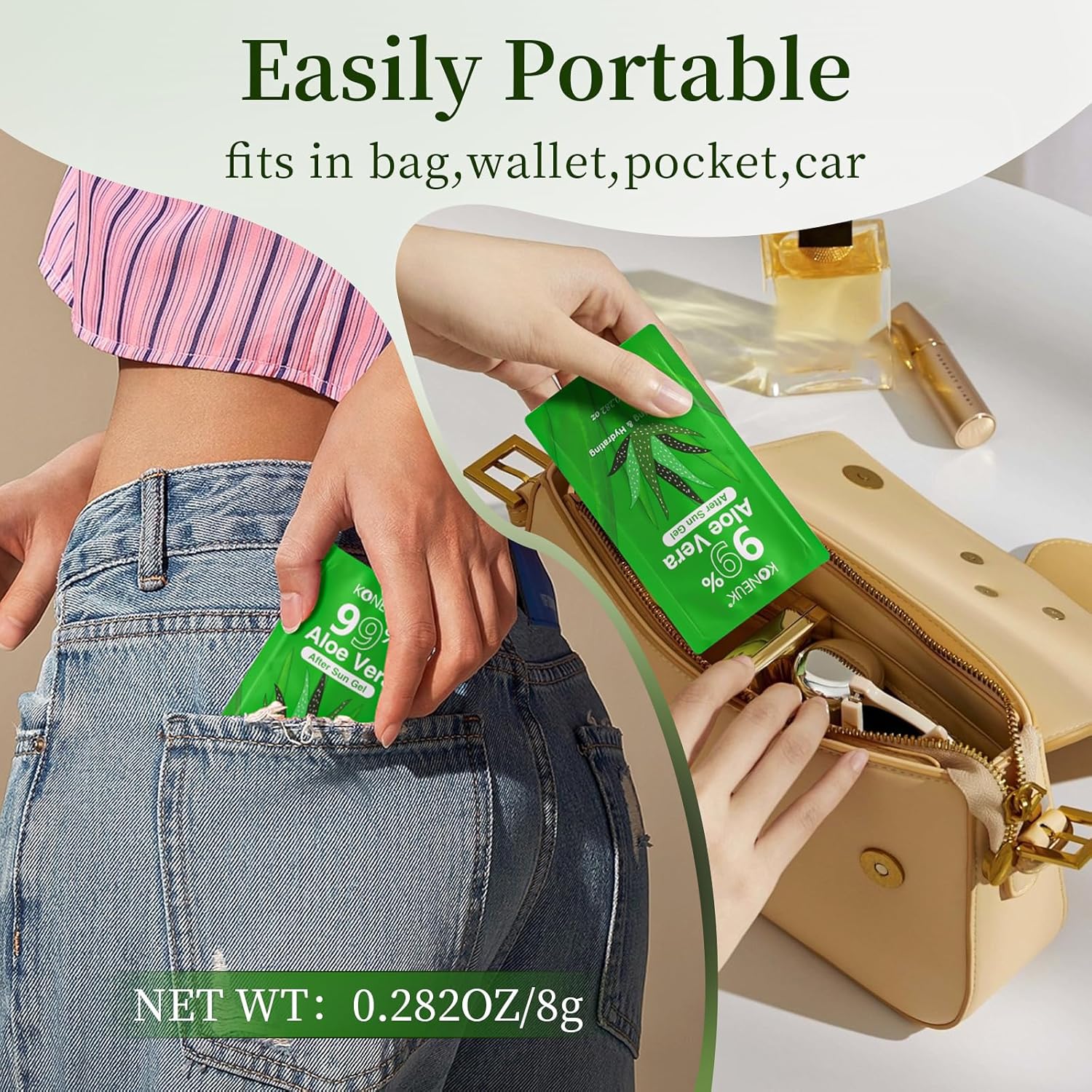 • 【99% Pure Aloe Vera Gel】This set of aloe vera gel has 100 packs,each pack is 0.282oz,each pack of aloe vera gel is individually packaged,which is very suitable for carrying around,when you use these aloe vera gel,you will feel very relaxed and cool,it quickly absorbed,and free of any sticky residue,leaving your skin moisturized and smooth