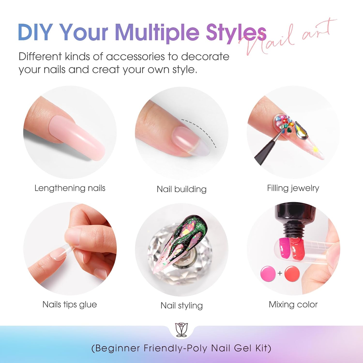 • Suitable for beginners:Our poly nail gel starter kit provides a operating Instructions to help you to DIY nails at home. 16 different colors, from nude to pink, cover all daily poly basic need, Moreover, our Nail Art box kit provides sparkling nail art accessories (glitter, lines, rhinestone) to help you realize novel nail art.