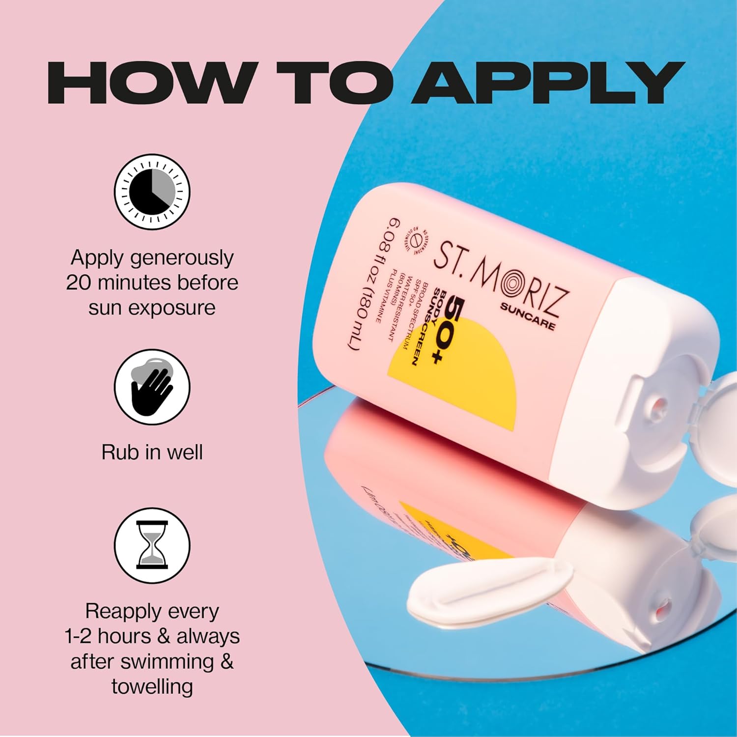 • HOW TO USE: Apply liberally 15 minutes before sun exposure. Reapply: After 80 minutes of swimming or sweating. Immediately after towel drying. At least every 2 hours.Being safe in the sun shouldn't be boring! Our daily use, broad spectrum protection formulas combine sunscreen & skincare to future-proof your skin! Use St. Moriz Suncare alongside St. Moriz Self Tan for a sun safe glow.