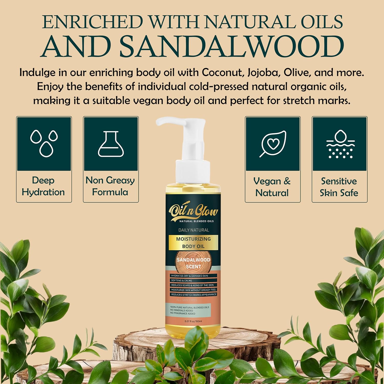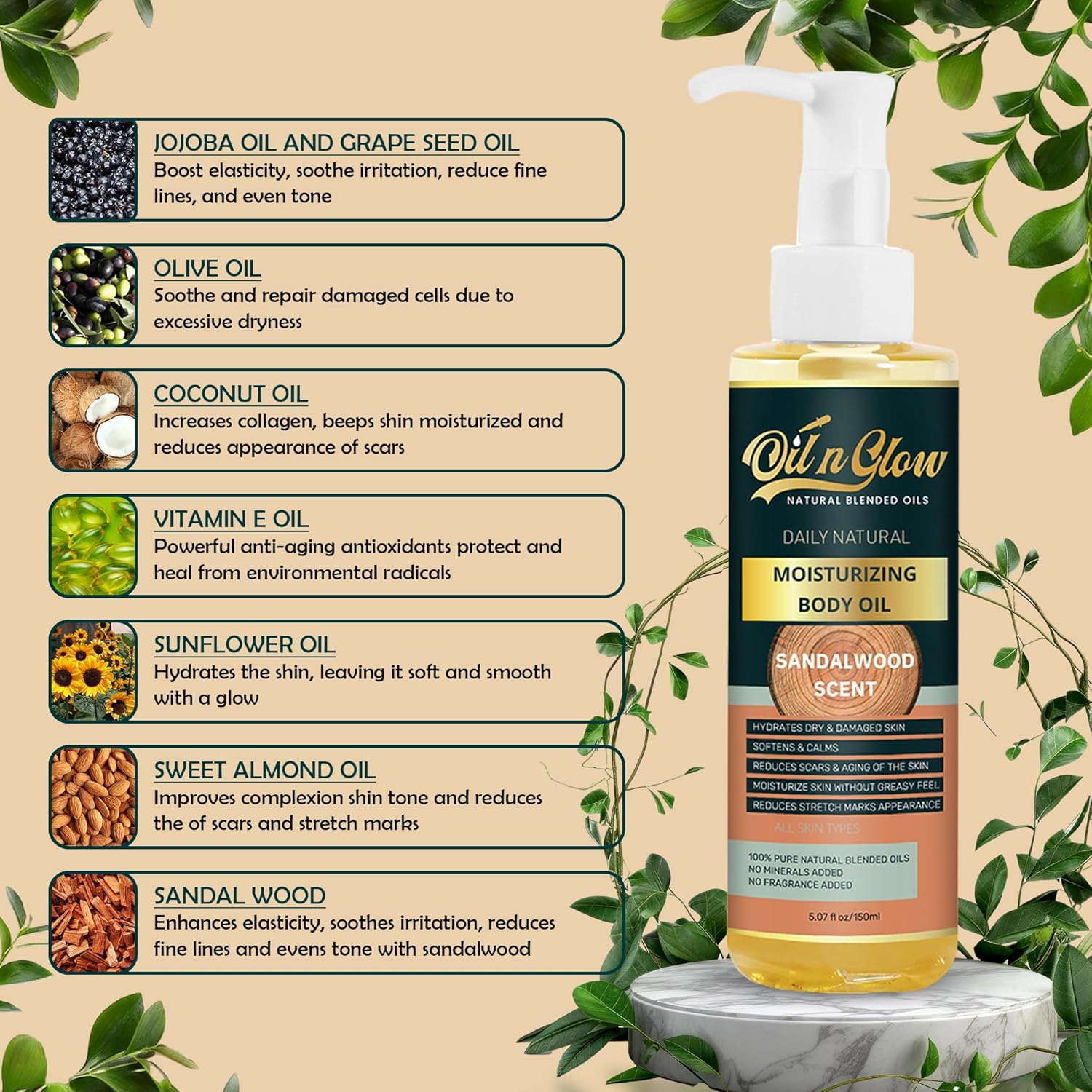 • QUICK ABSORBING AND NON-GREASY: Enjoy the lightweight feel of our non greasy body oil that absorbs quickly into the skin without clogging pores. This sandalwood body oil for dry skin is perfect for daily use, whether you need a refreshing body oil after shower or a calming massage experience. The natural blend of coconut hydrate body oil, jojoba oil for skin, and olive oil for skin ensures a silky, velvety texture, delivering hydration without the sticky feel.