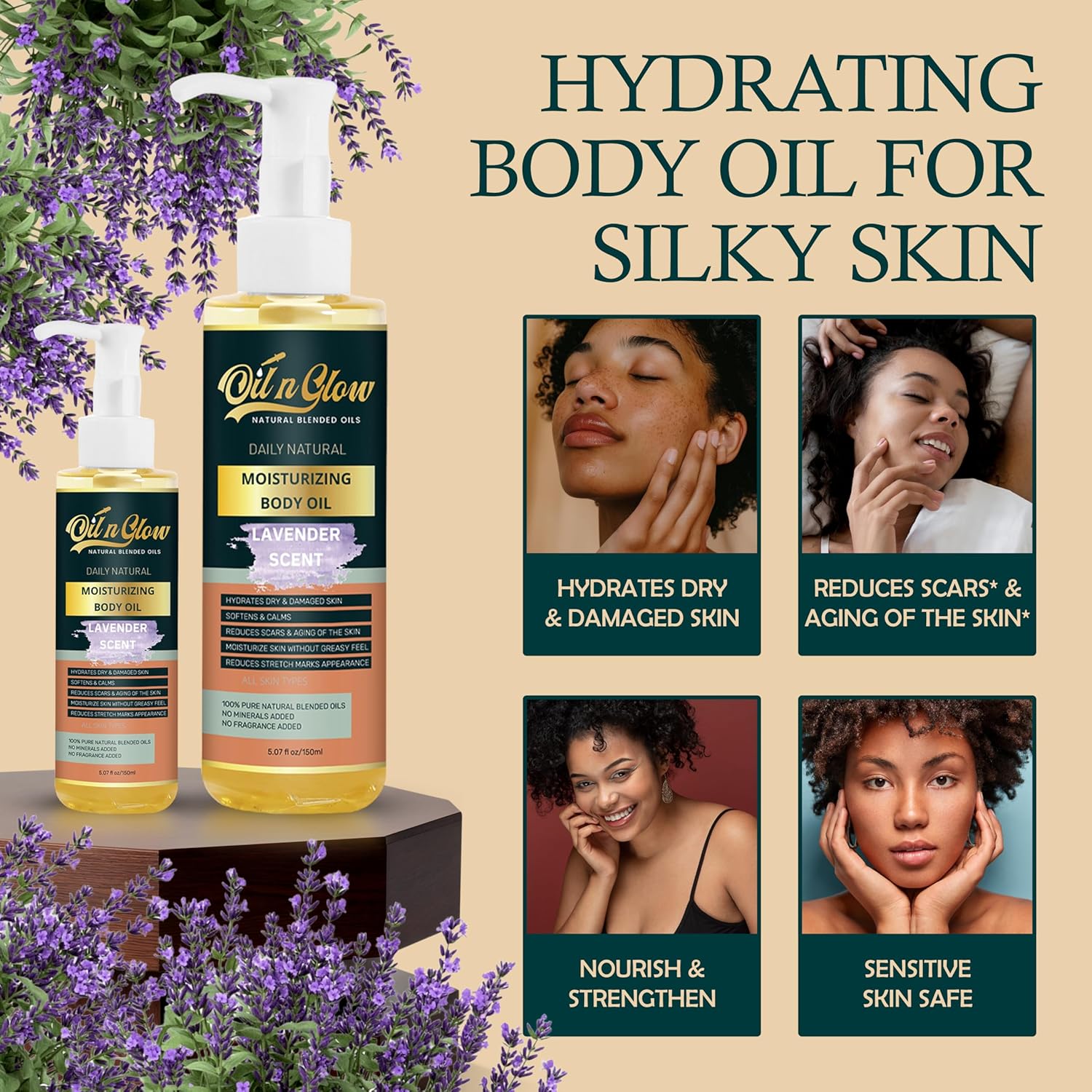 • QUICK ABSORBING AND NON-GREASY: Enjoy the lightweight feel of our non greasy body oil that absorbs quickly into the skin without clogging pores. This lavender body oil for dry skin is perfect for daily use, whether you need a refreshing body oil after shower or a calming massage experience. The natural blend of coconut hydrate body oil, jojoba oil for skin, and olive oil for skin ensures a silky, velvety texture, delivering hydration without the sticky feel.