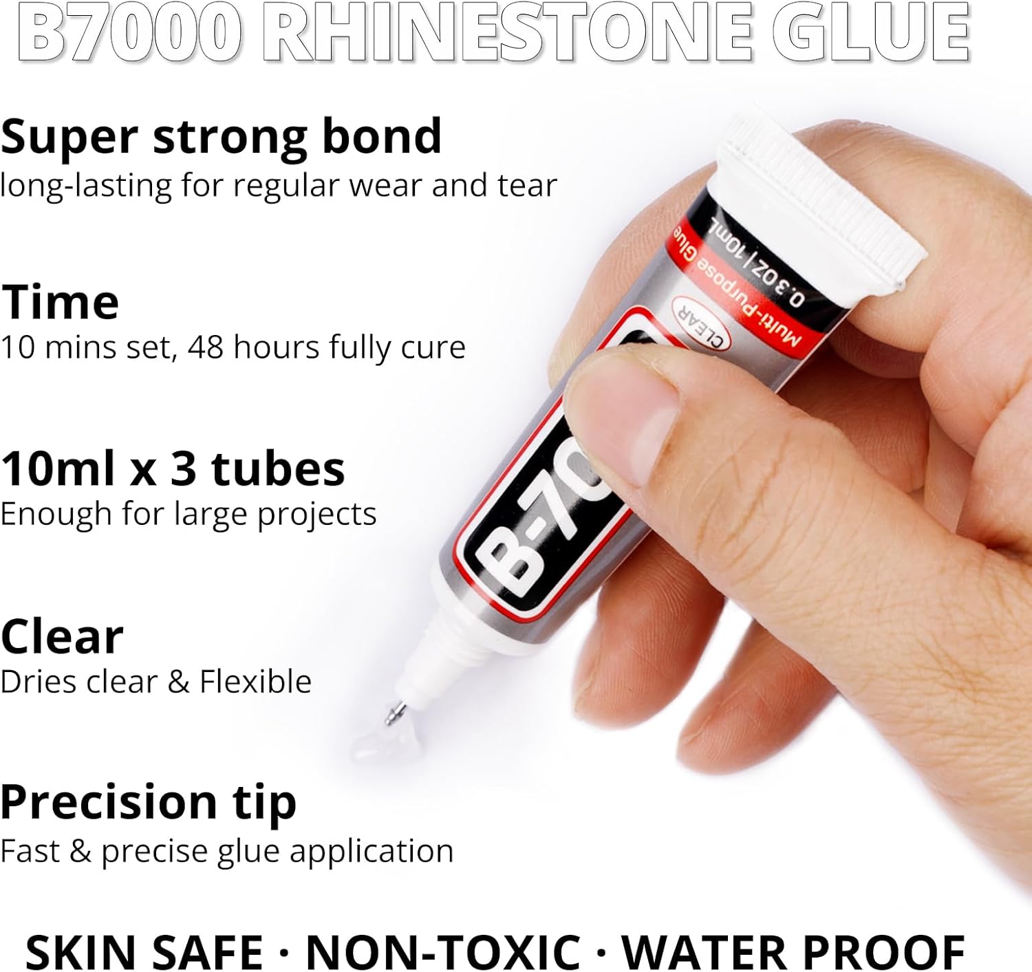 • B7000 Clear Glue for Gemstones -- B7000 glue has strong adhesion and dries clear, waterproof when dried, non-toxic and harmless to the skin. The glue has a precision needle for easy application, they can be applied precisely