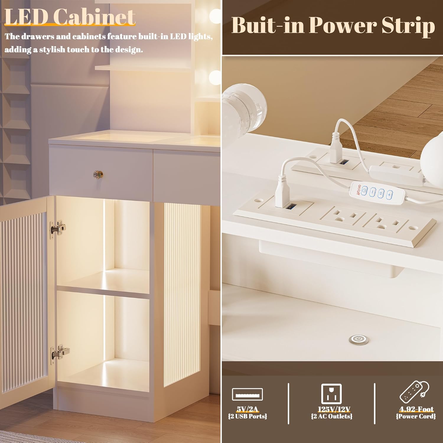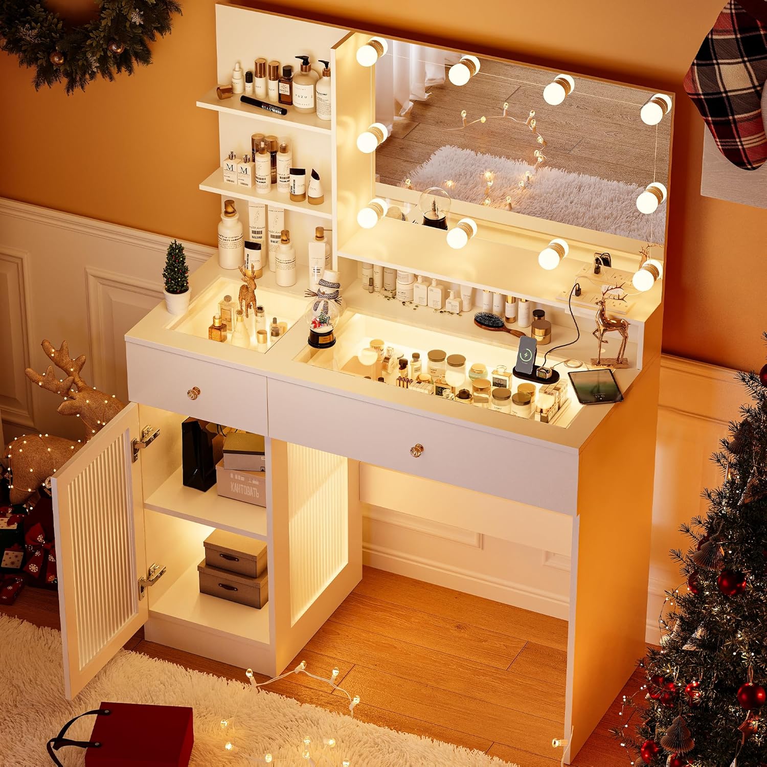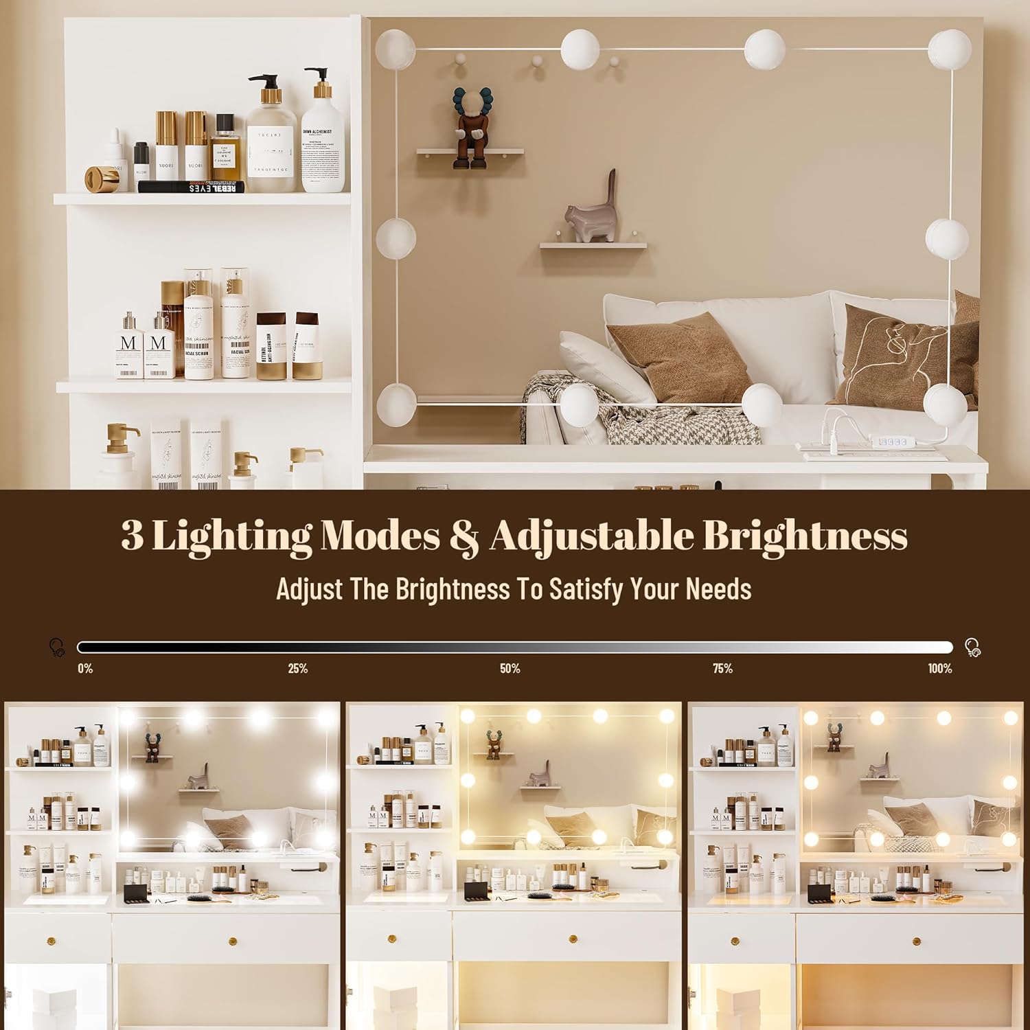 • 【Ample Storage Space】white vanity with lighted mirror offers a compact design without compromising on storage capacity. With 2 drawer, 3 shelves, and a acrylic 2-tier storage cabinet, you can easily store and access all your makeup essentials, jewelry, perfumes, hair straighteners, and more.