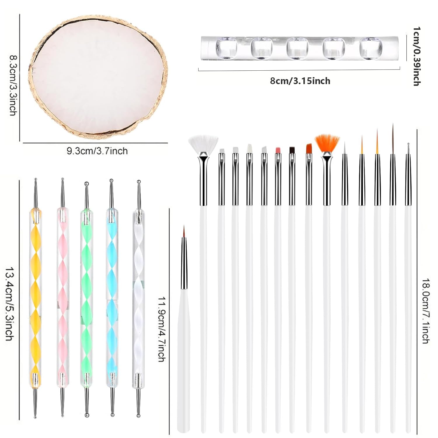 • 【Package Includes】You will receive a nail tool set which includes 15 nail brushes, 5 double-ended mixed size dispensing tools and 1 gold edge resin nail palette.
