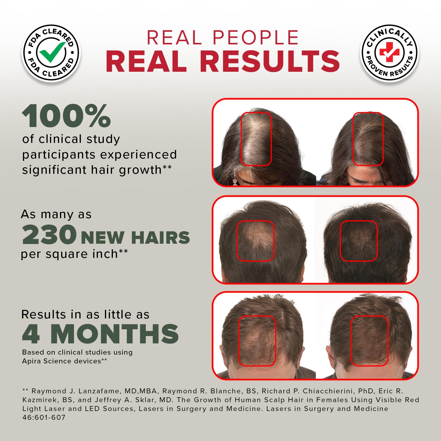 • FDA-Cleared: Hair growth device clinically-proven 100% effective in hair regrowth for men and women. Two double-blind placebo hair loss treatment clinical trials. Results peer-reviewed and published in the Lasers in Surgery and Medicine medical journal.