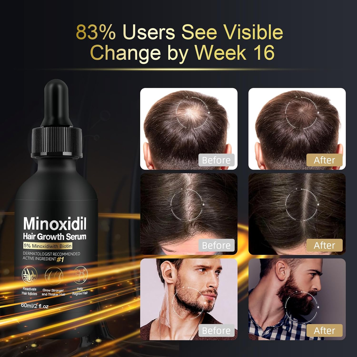 • POWERFUL HAIR GROWTH SERUM FOR MEN AND WOMEN: Transform your hair with our advanced hair growth serum crafted with 5% Minoxidil. Clinically proven to stimulate hair regrowth, this powerful formula revitalizes thinning hair and promotes visibly thicker, fuller, and healthier hair for both men and women. Experience real results in as little as 8-12 weeks with consistent use, with full results typically visible after 3-6 months. Continued use is recommended to maintain hair regrowth for men and women.