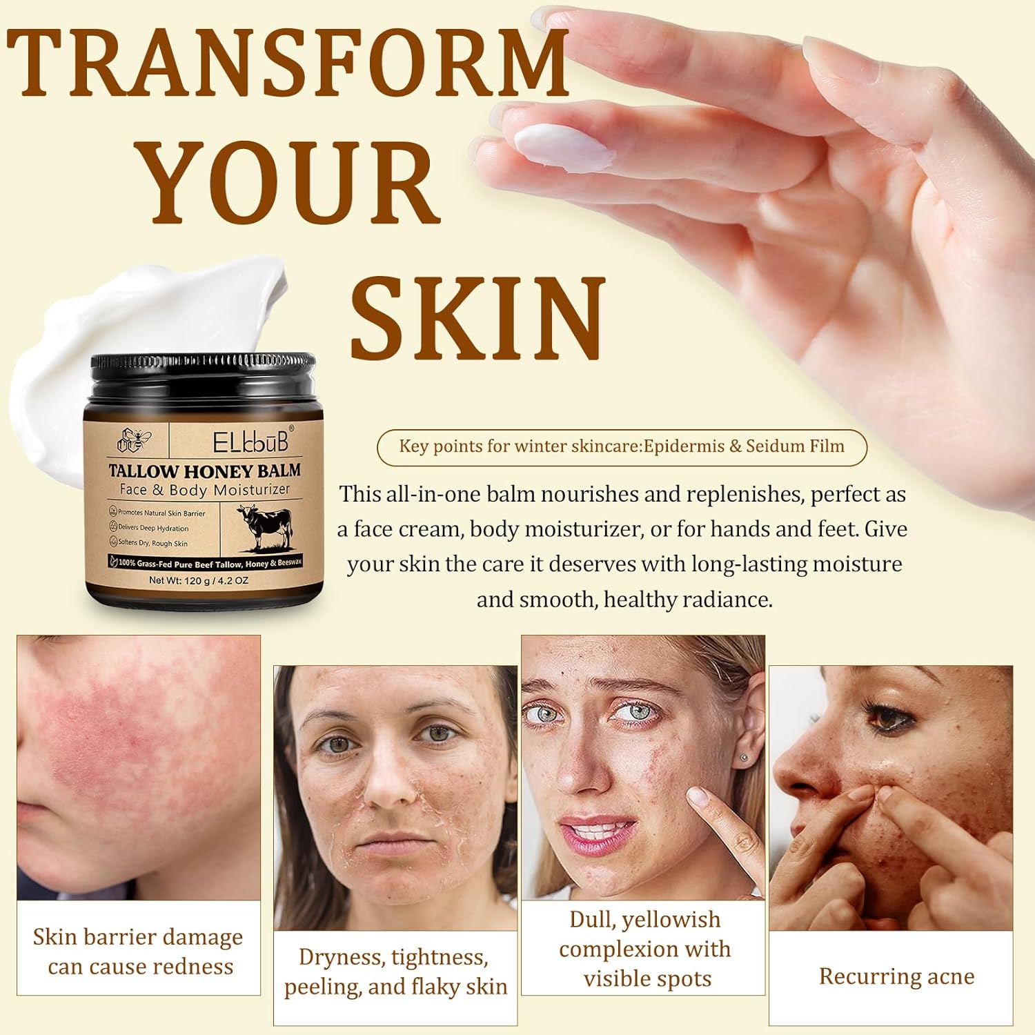 • Premium Natural Ingredients: Made with organic, grass-fed beef tallow, raw wild honey, and beeswax, providing superior skin nourishment.
