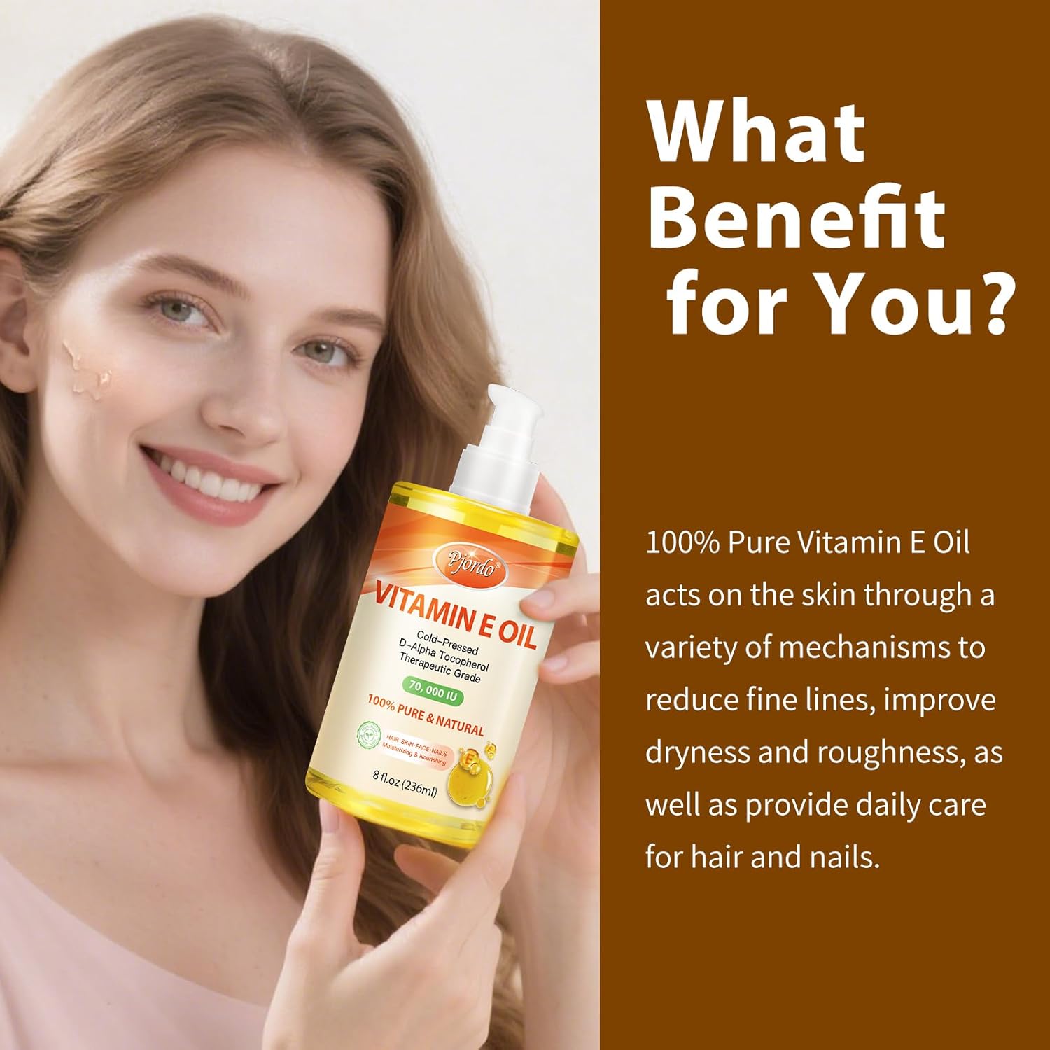 100% Pure Vitamin E Oil, 70,000 IU Organic Vitamin E for Scars, Skin, Face, Nails & Hair, Cold-Pressed Body Oil Nourishes & Moisturizes All Skin Types for Improving Skin Texture
